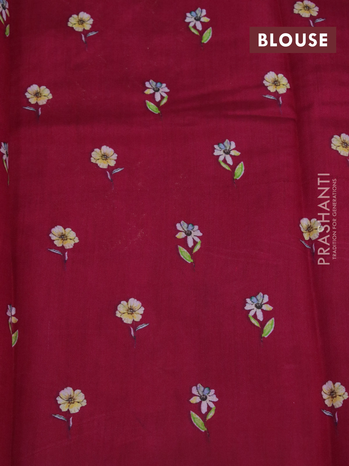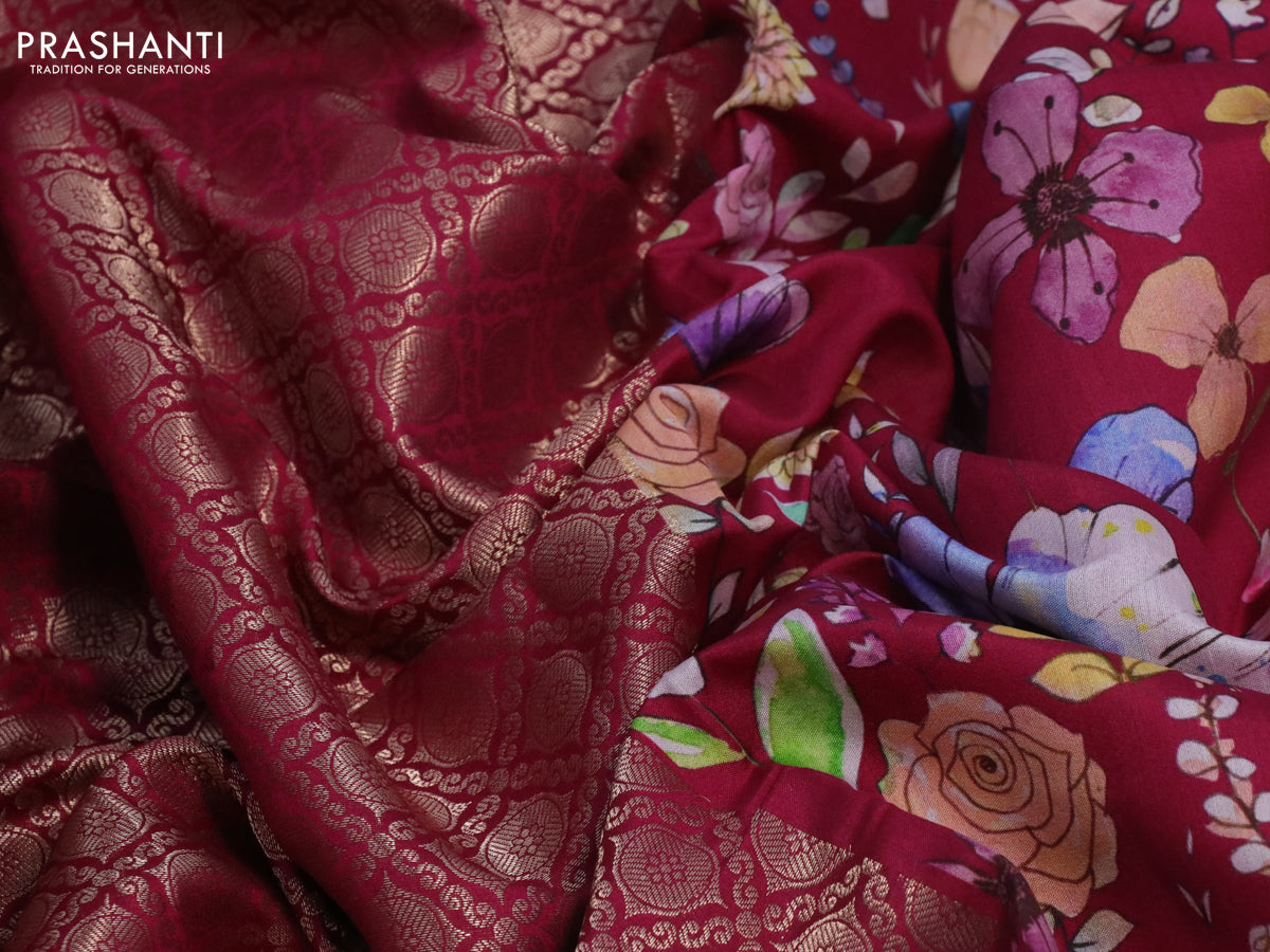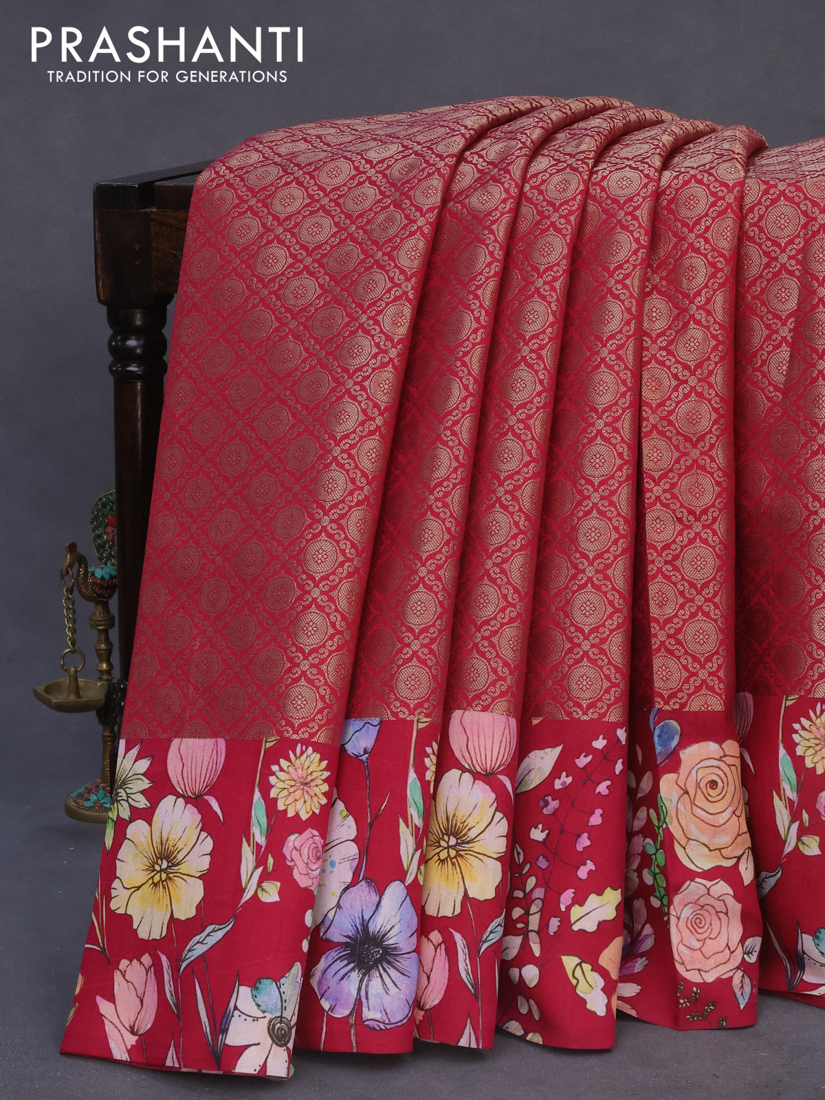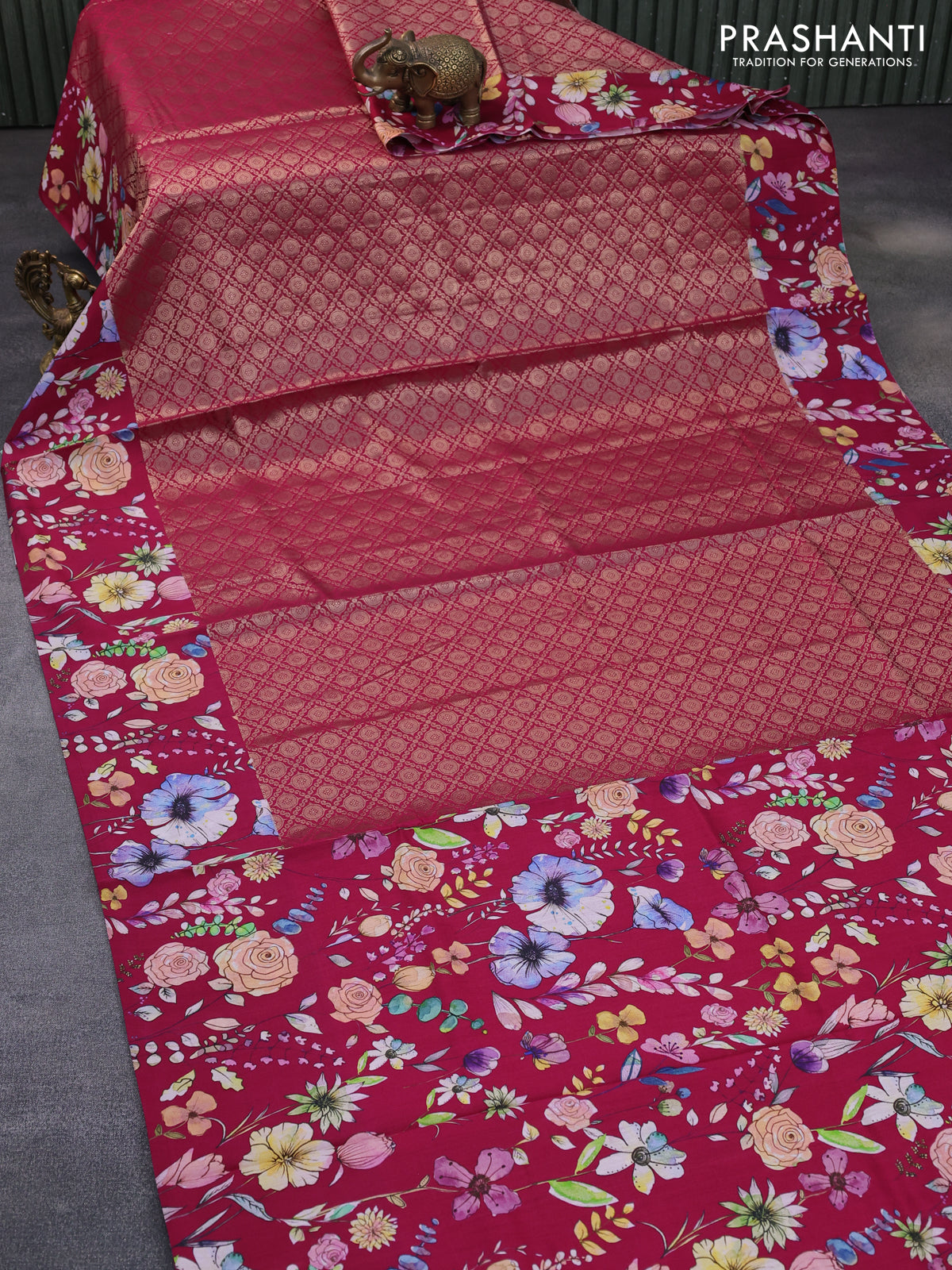 Banarasi silk saree dark pink with allover zari woven brocade weaves and floral digital printed border