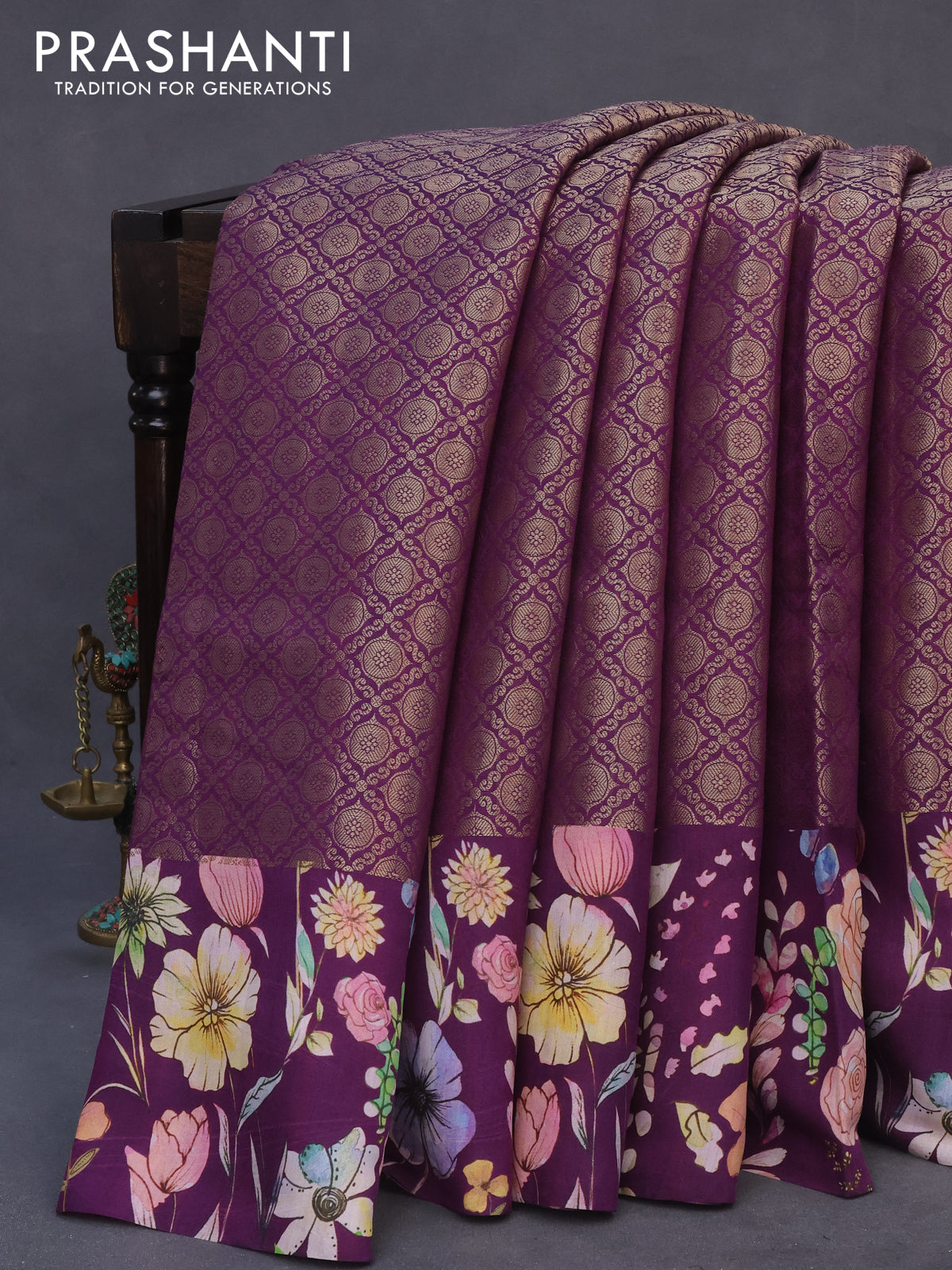 Banarasi silk saree deep purple with allover zari woven brocade weaves and floral digital printed border