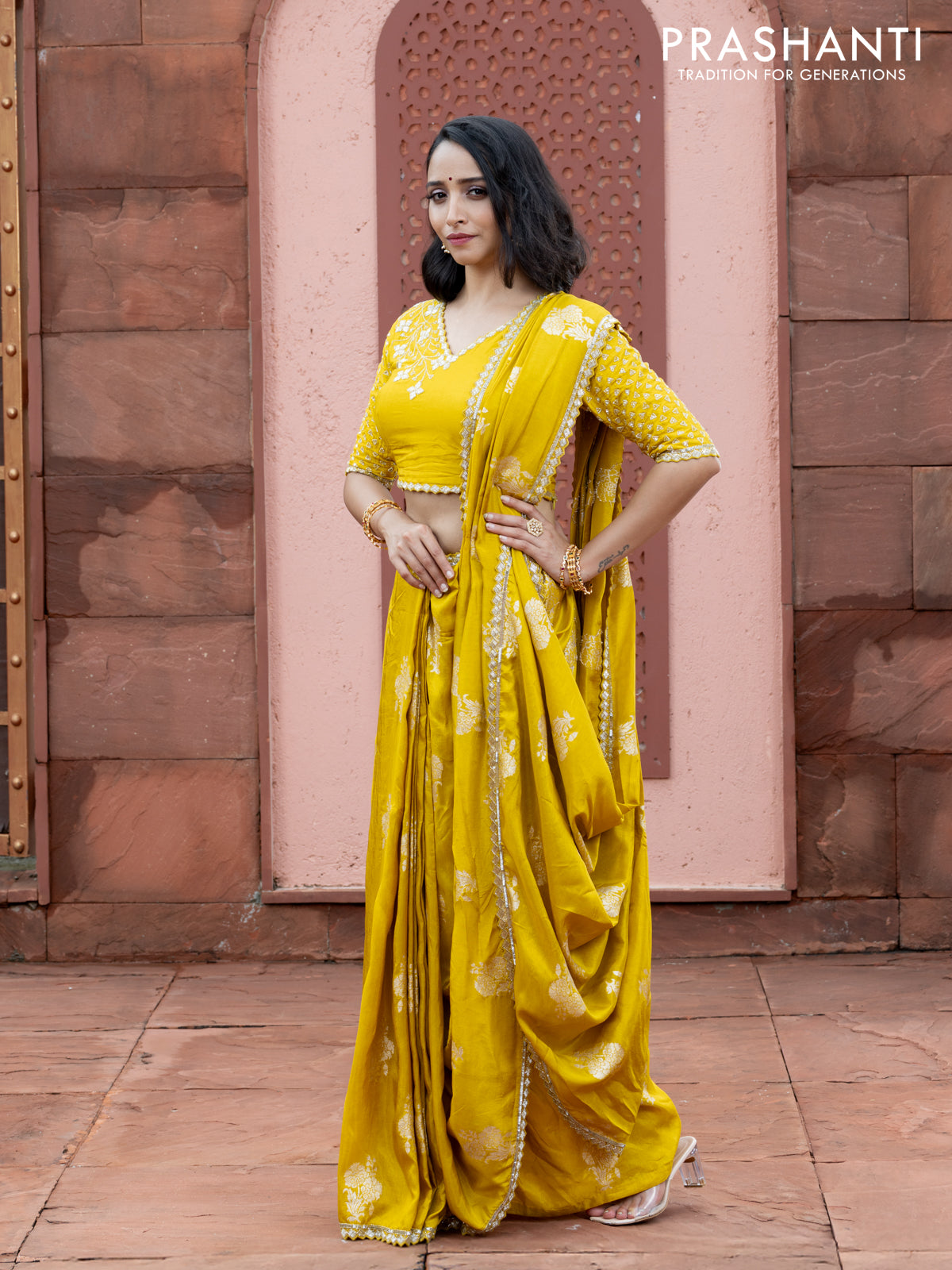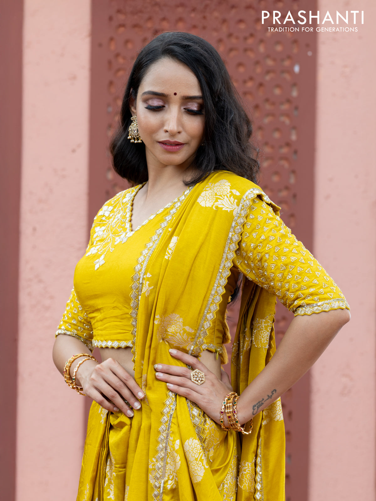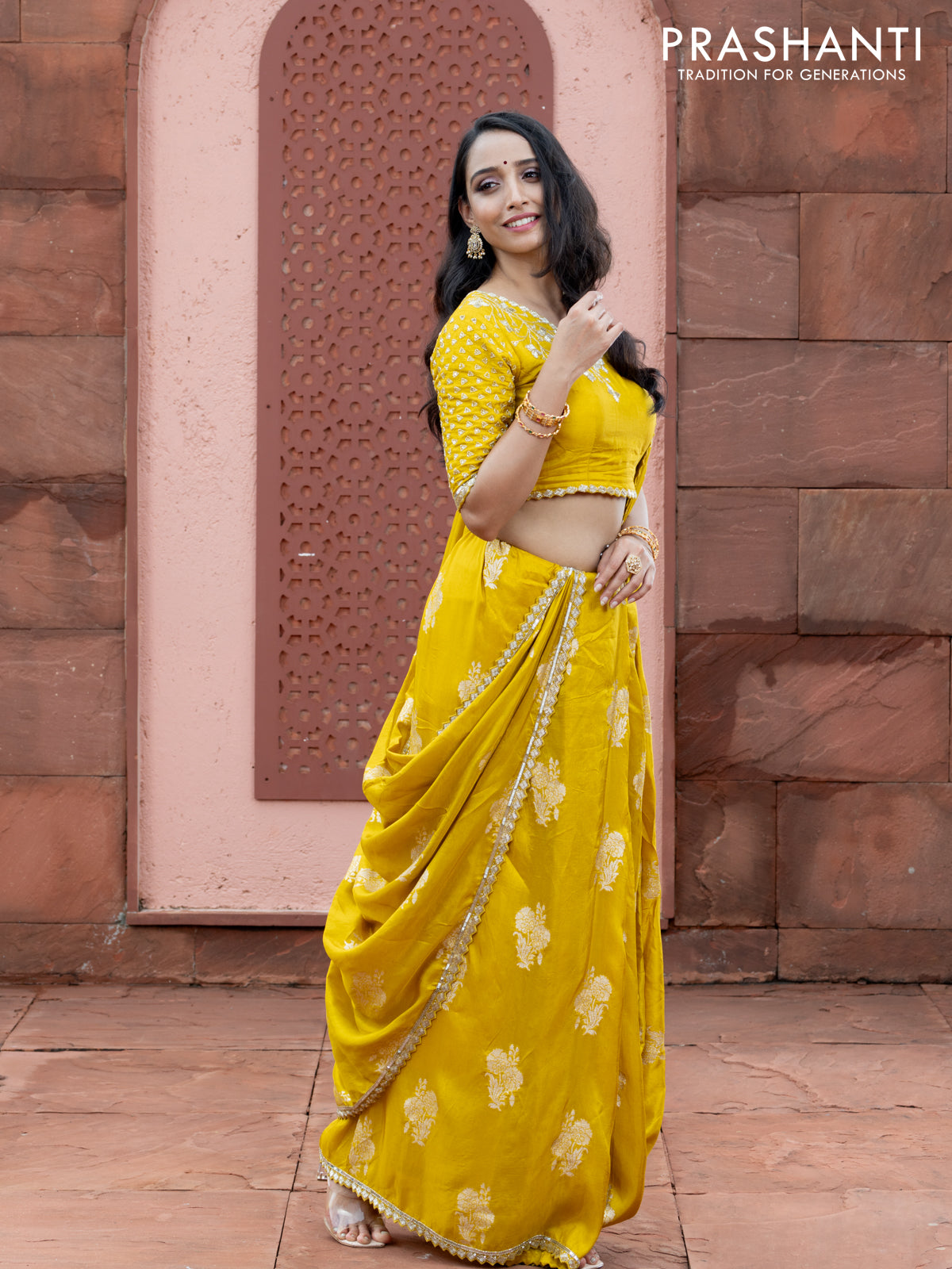 Banarasi silk saree lime yellow with floral zari woven buttas and beaded work border