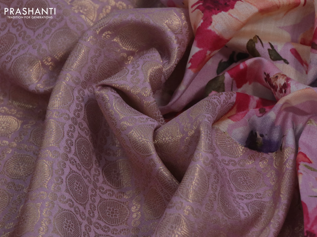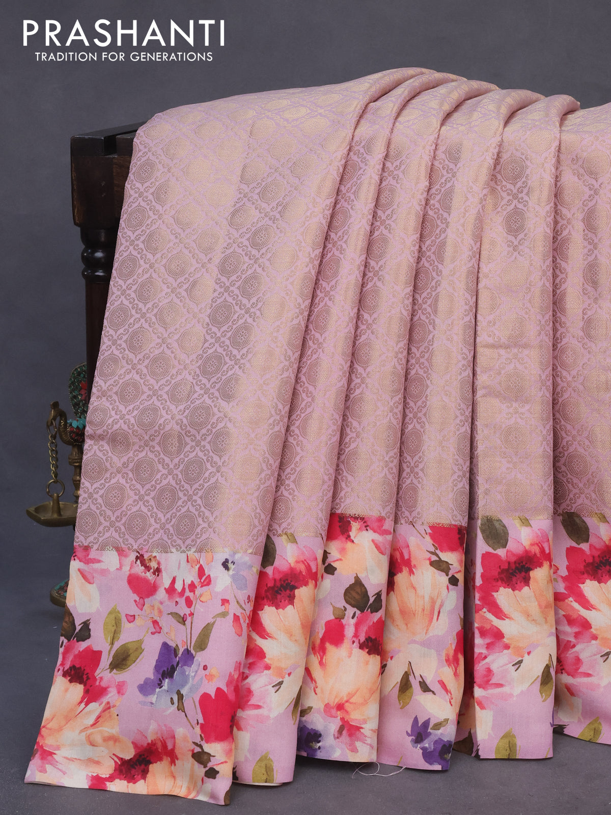 Banarasi silk saree lotus pink with allover zari woven brocade weaves and floral digital printed border