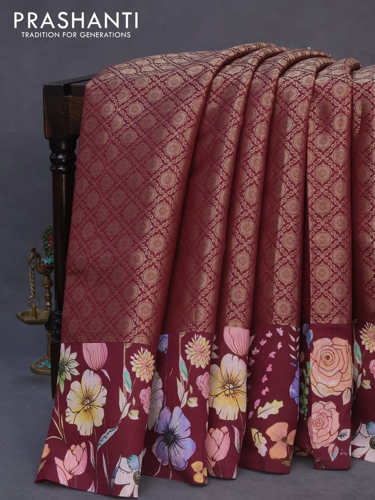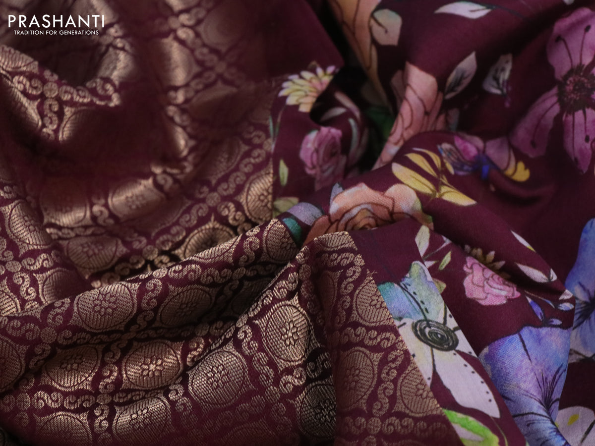 Banarasi silk saree maroon with allover zari woven brocade weaves and floral digital printed border