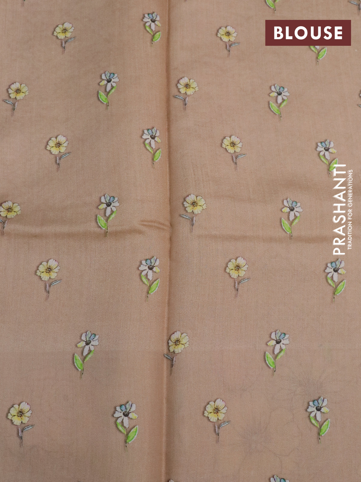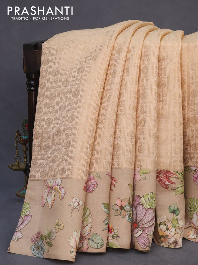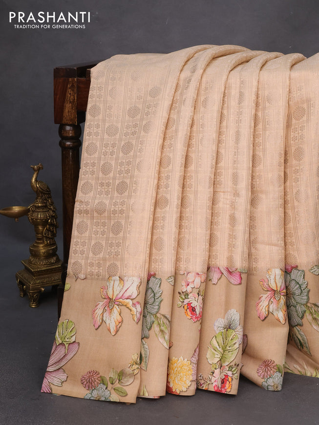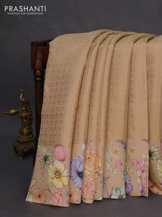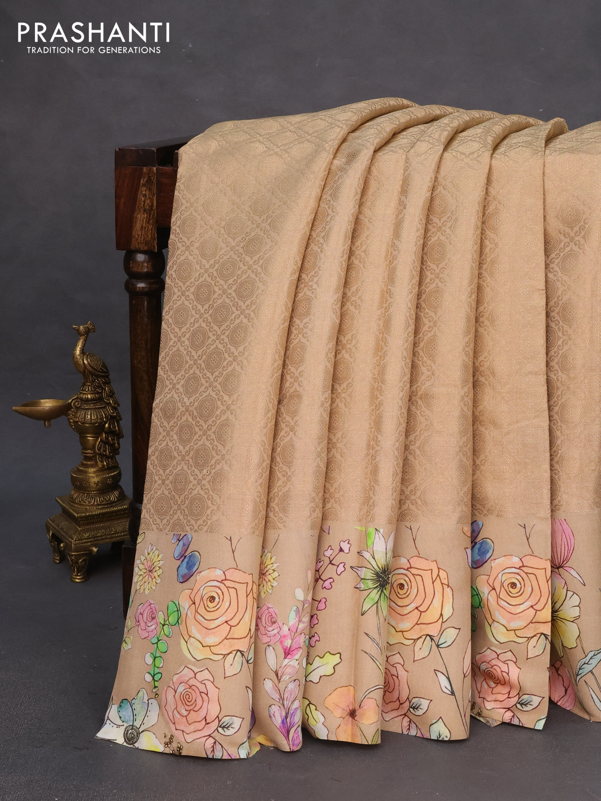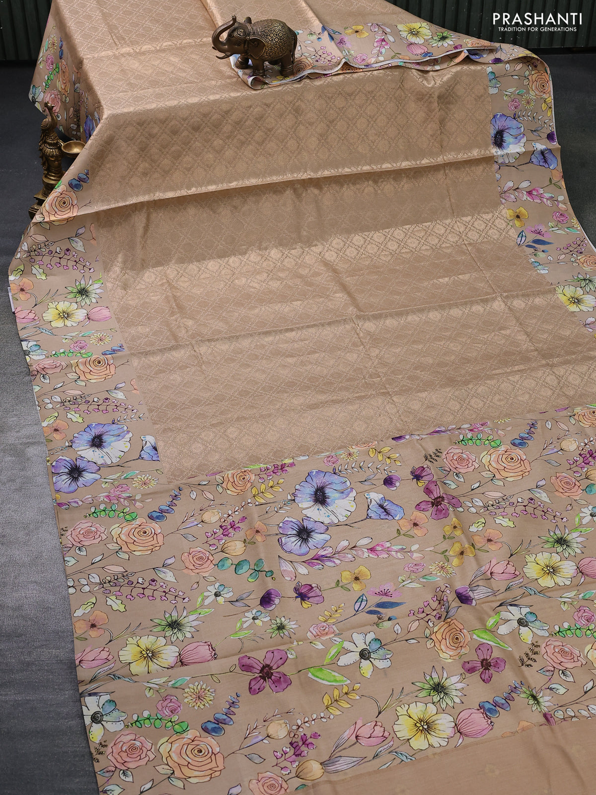 Banarasi silk saree sandal with allover zari woven brocade weaves and floral digital printed border
