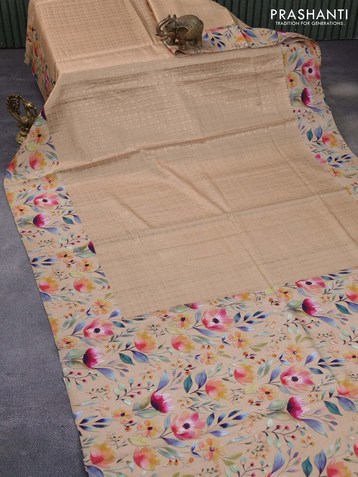 Banarasi silk saree sandal with allover zari woven brocade weaves and floral digital printed border