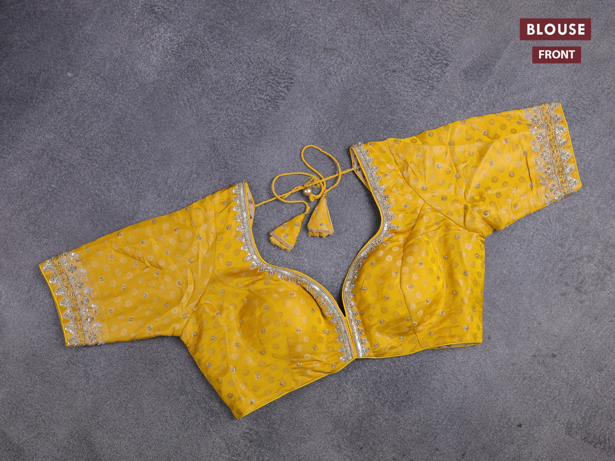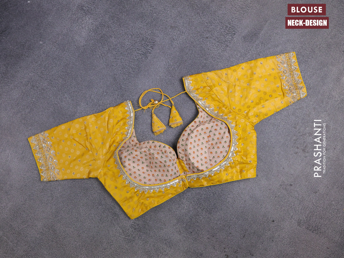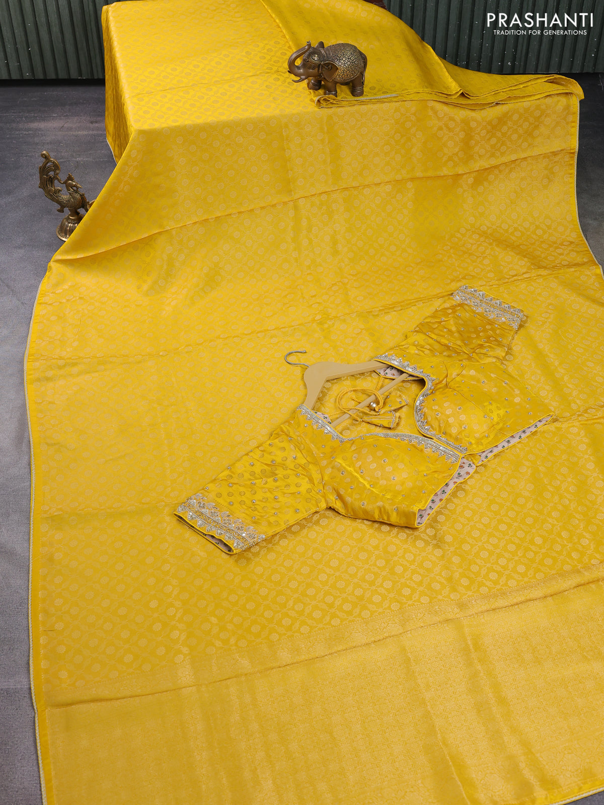 Banarasi silk saree yellow with allover zari woven brocade weaves and lace work border