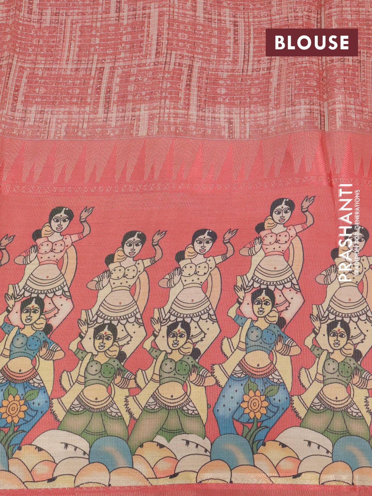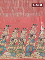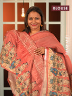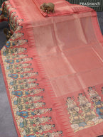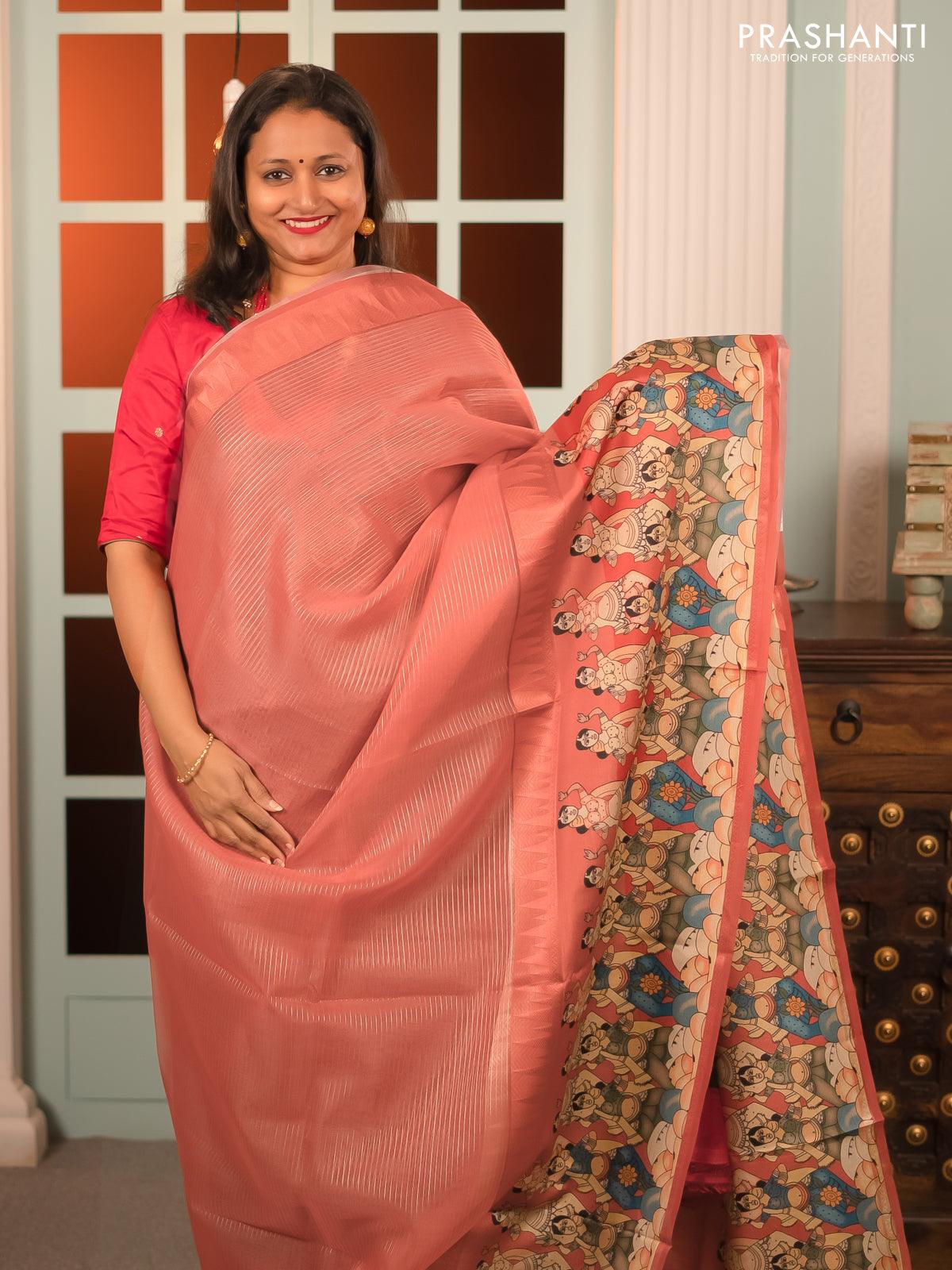 Banarasi tissue organza saree maroon shade with plain body and kalamkari printed border