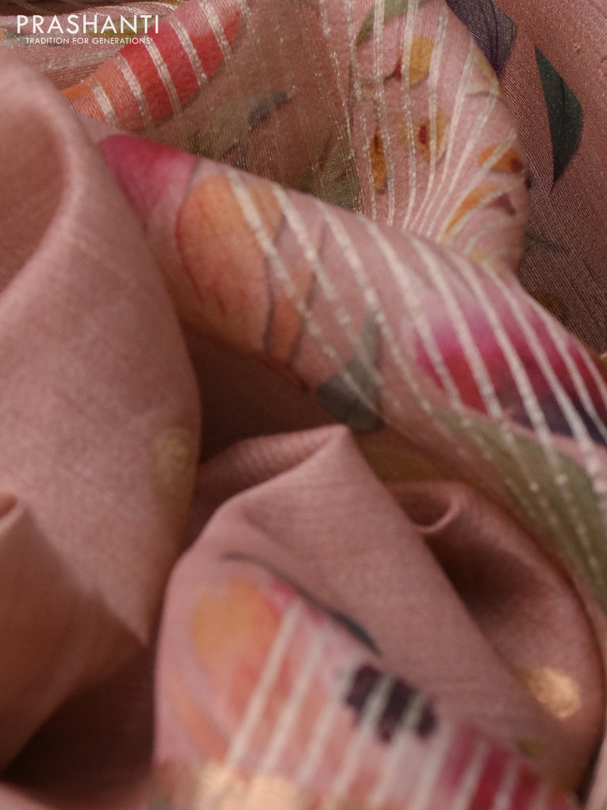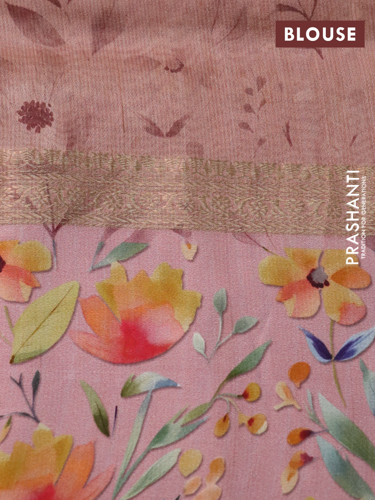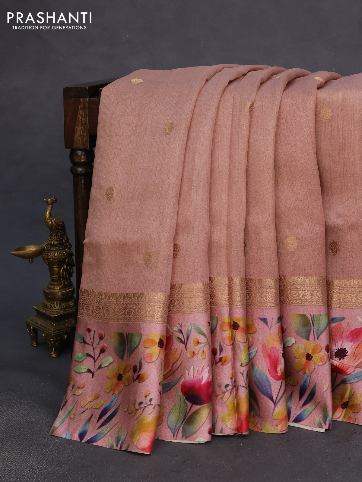 Banarasi tussar silk saree pastel brown and pastel pink with zari woven buttas and zari woven floral digital printed border
