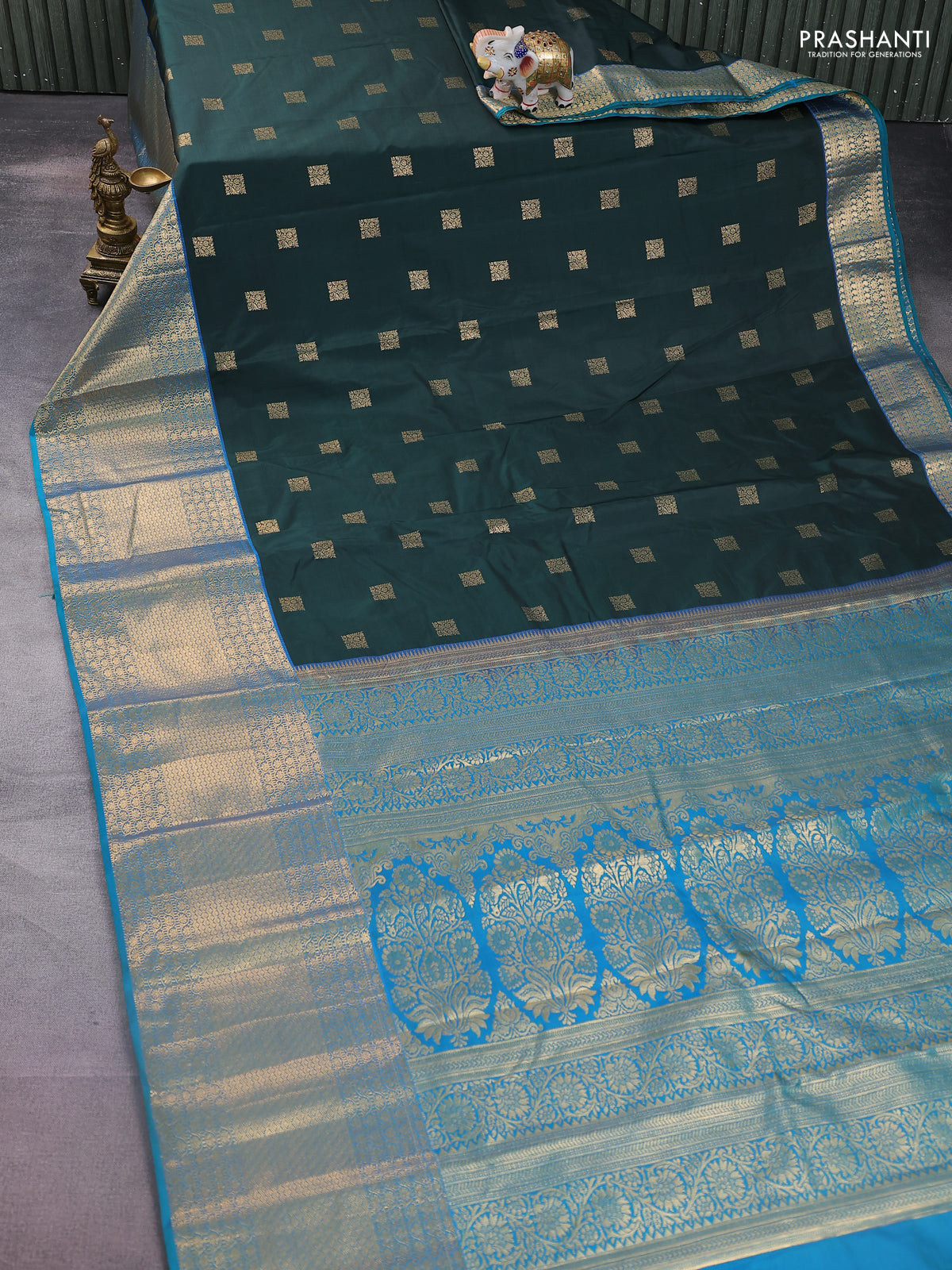 Bangalori silk saree bottle green and teal blue with allover zari woven buttas and long zari woven border and Butta style