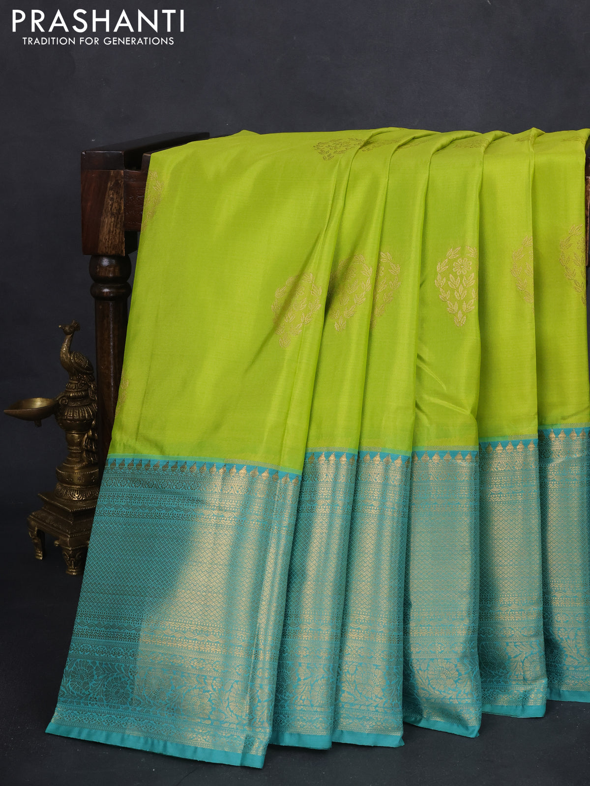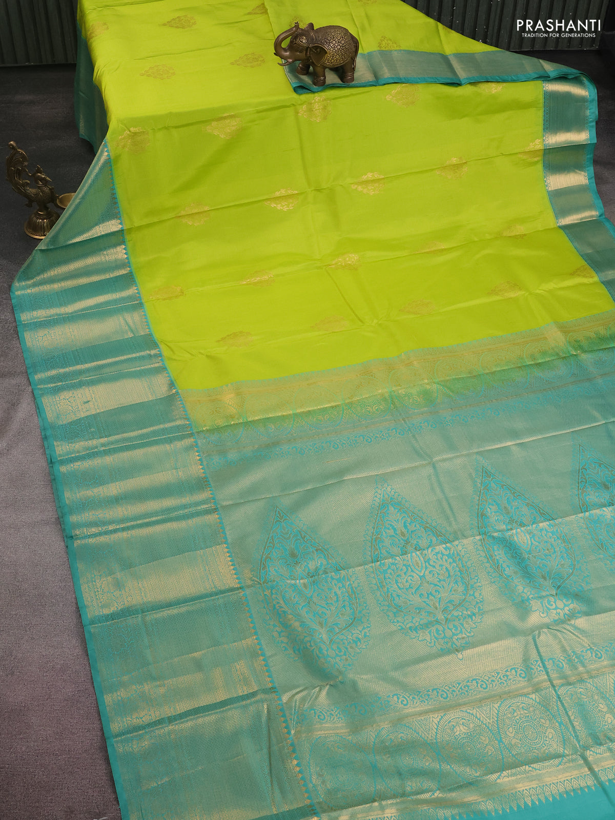 Bangalori silk saree fluorescent green and teal green shade with zari woven buttas and long zari woven border and Butta style