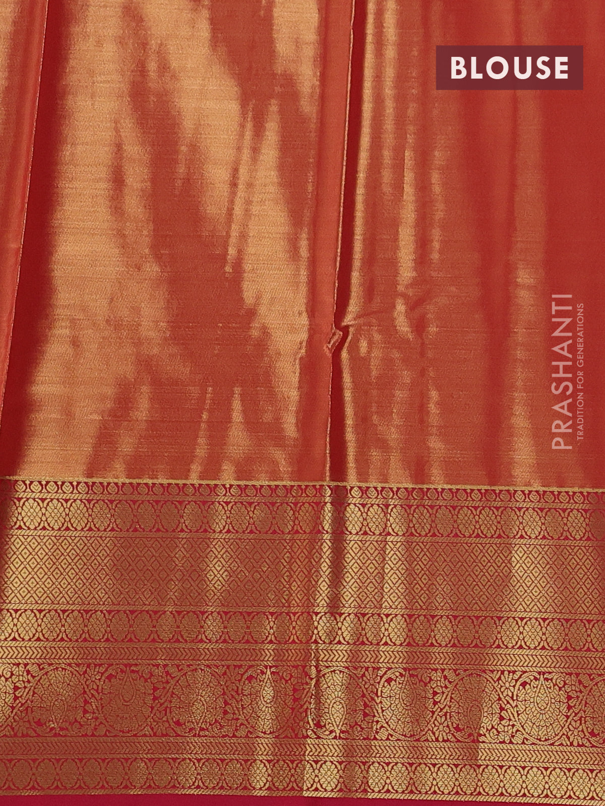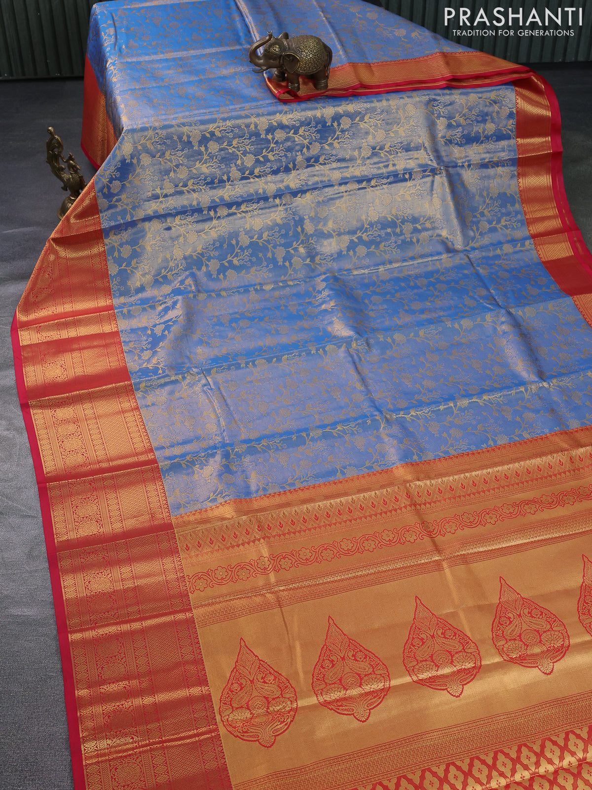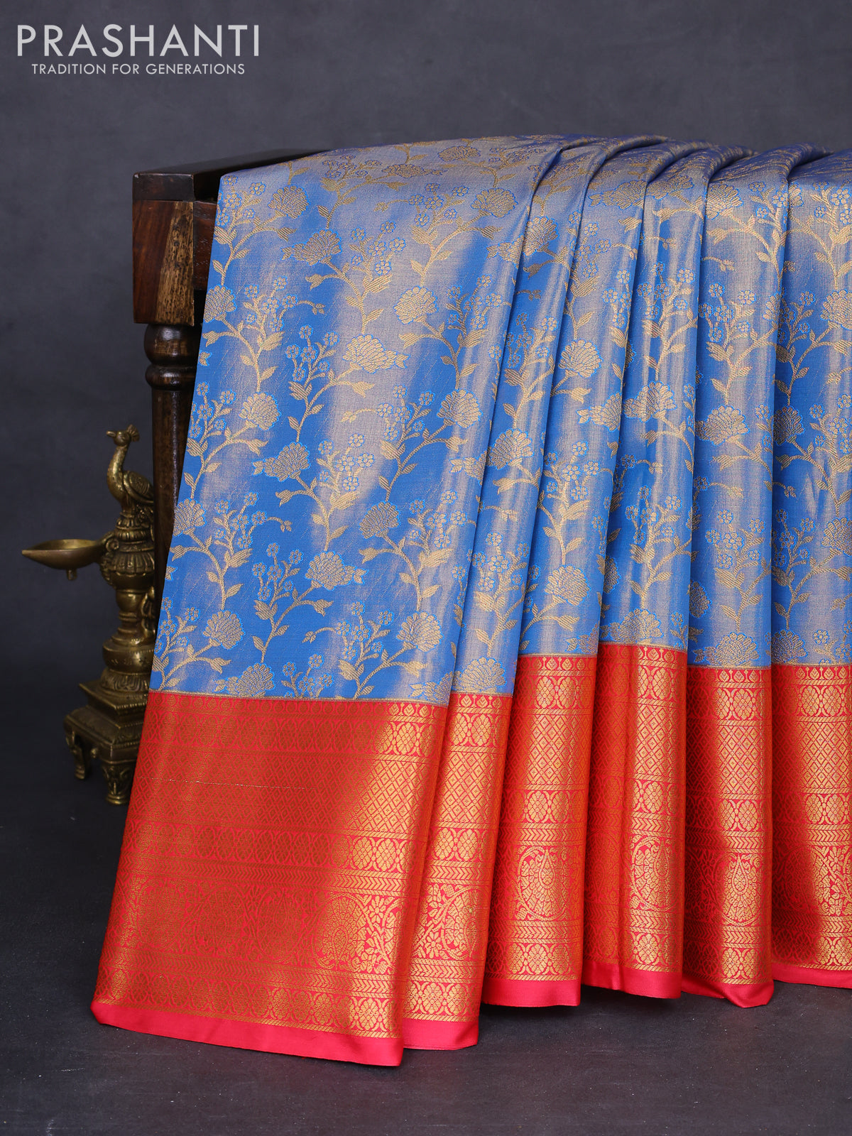 Bangalori tissue silk saree dual shade of blue and reddish pink with allover zari woven brocade weaves and long zari woven border