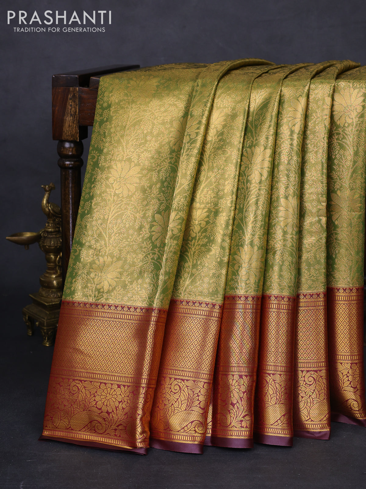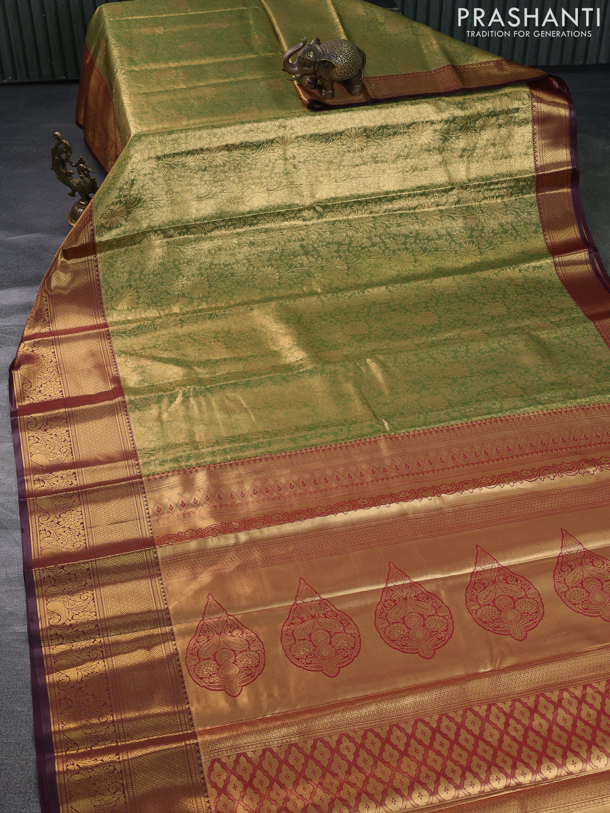 Bangalori tissue silk saree dual shade of green and deep maroon with allover zari woven brocade weaves and long zari woven border