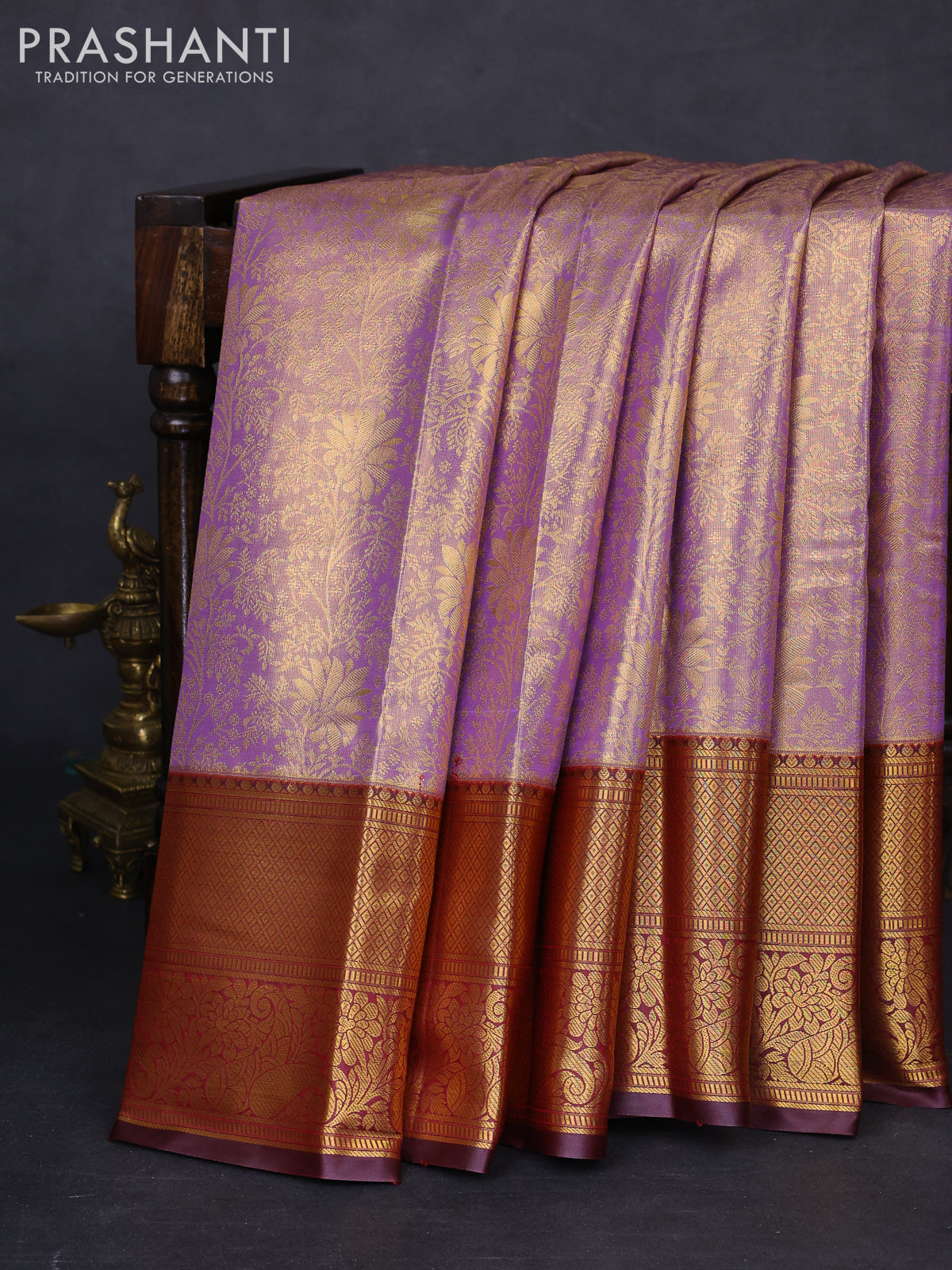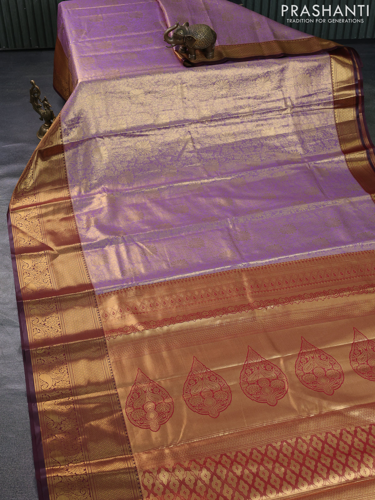 Bangalori tissue silk saree lavender and deep maroon with allover zari woven brocade weaves and long zari woven border