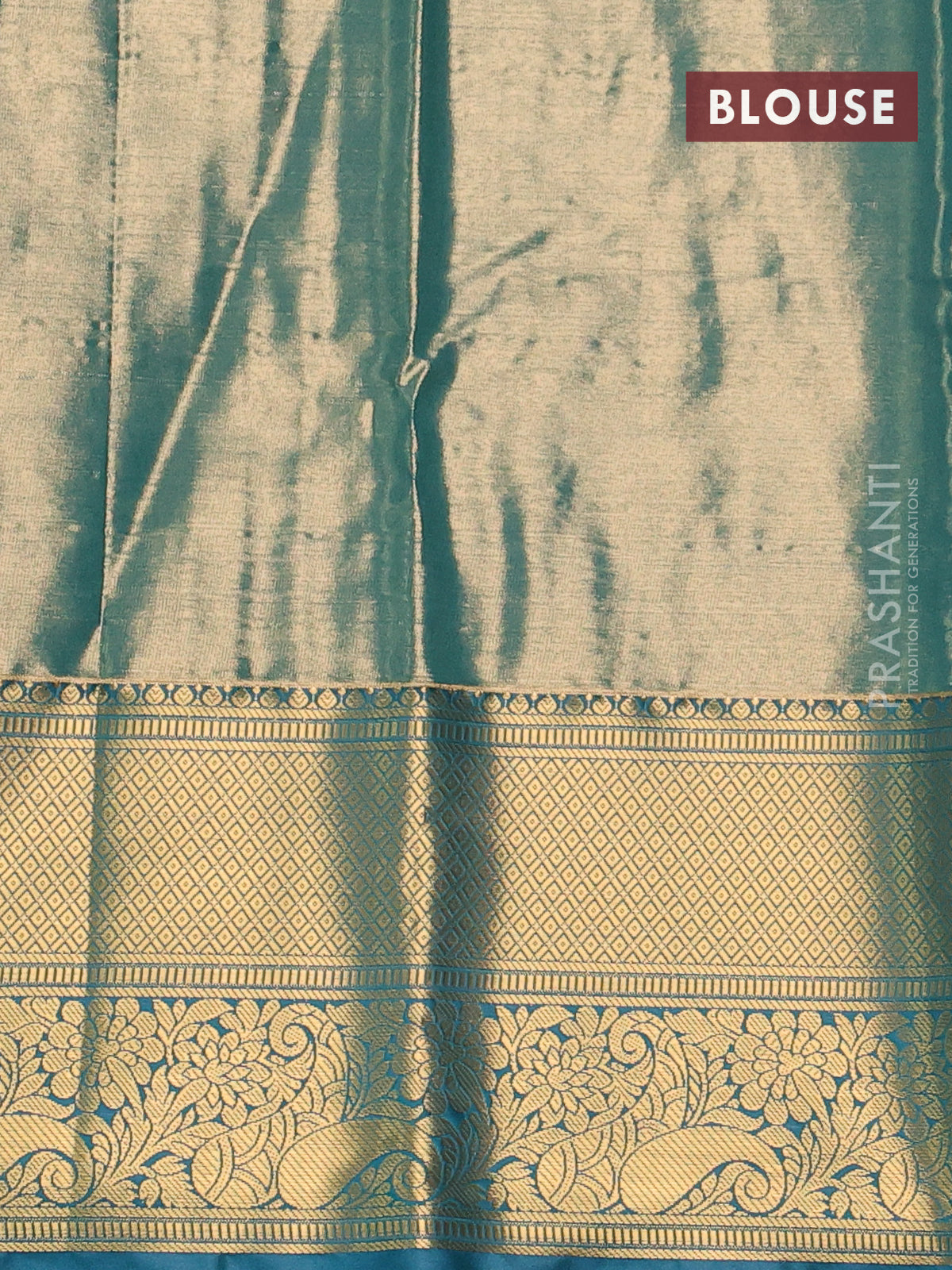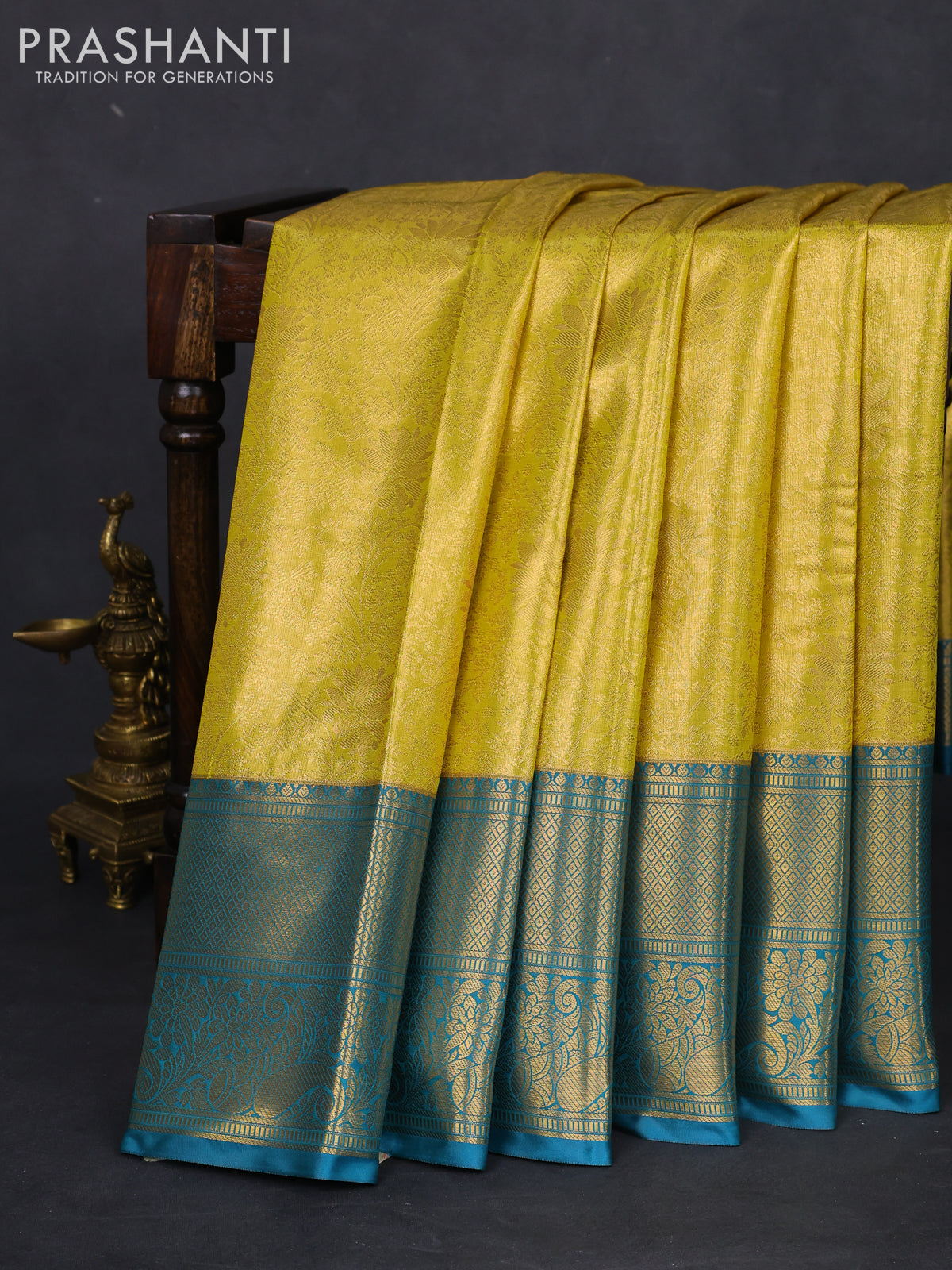 Bangalori tissue silk saree lime yellow and peacock blue with allover zari woven brocade weaves and long zari woven border