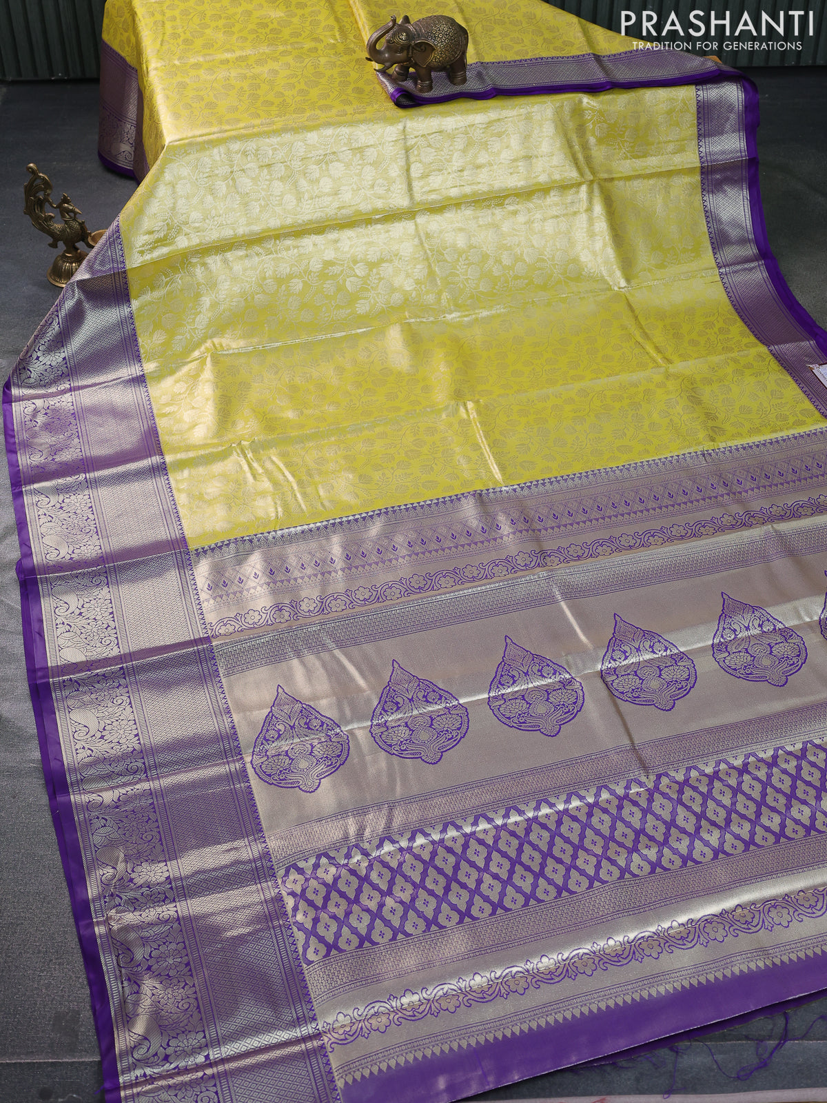 Bangalori tissue silk saree lime yellow and violet with allover zari woven brocade weaves and long zari woven border