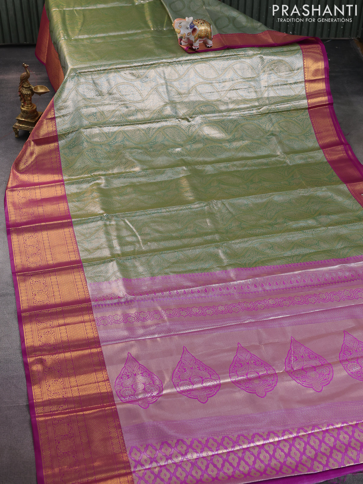 Bangalori tissue silk saree pastel green and purple with allover zari woven brocade weaves and long zari woven border