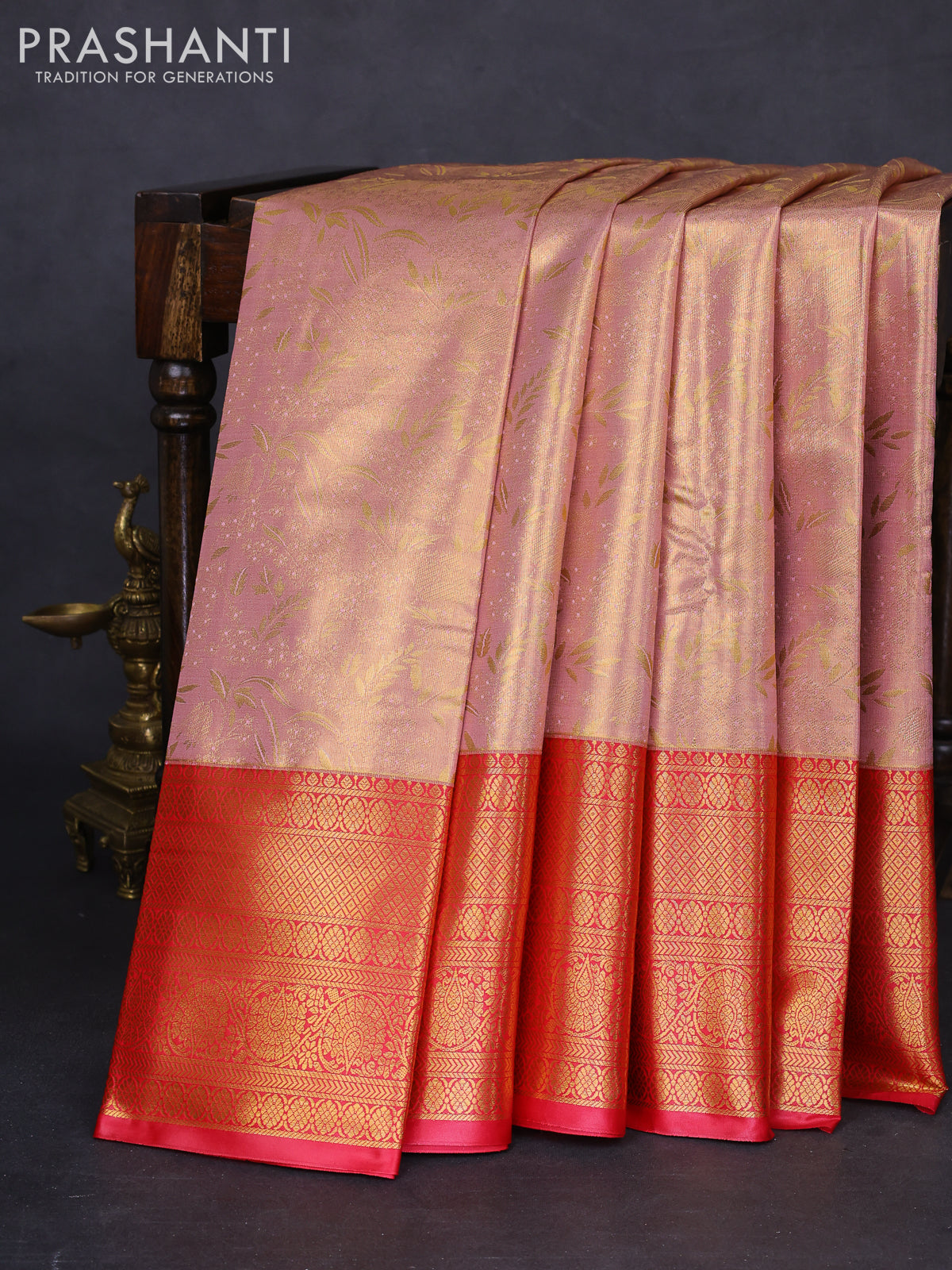 Bangalori tissue silk saree pastel pink and pink with allover zari woven brocade weaves and long zari woven border