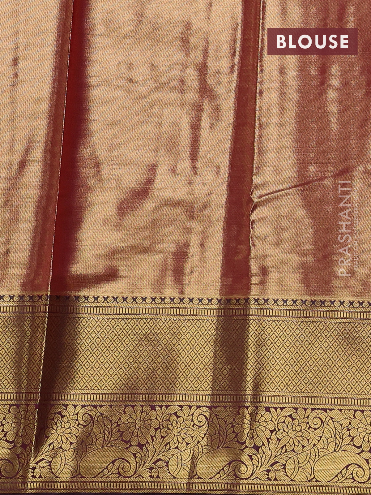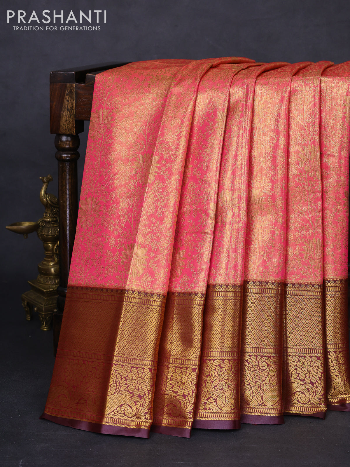 Bangalori tissue silk saree peach pink and deep maroon with allover zari woven brocade weaves and long zari woven border