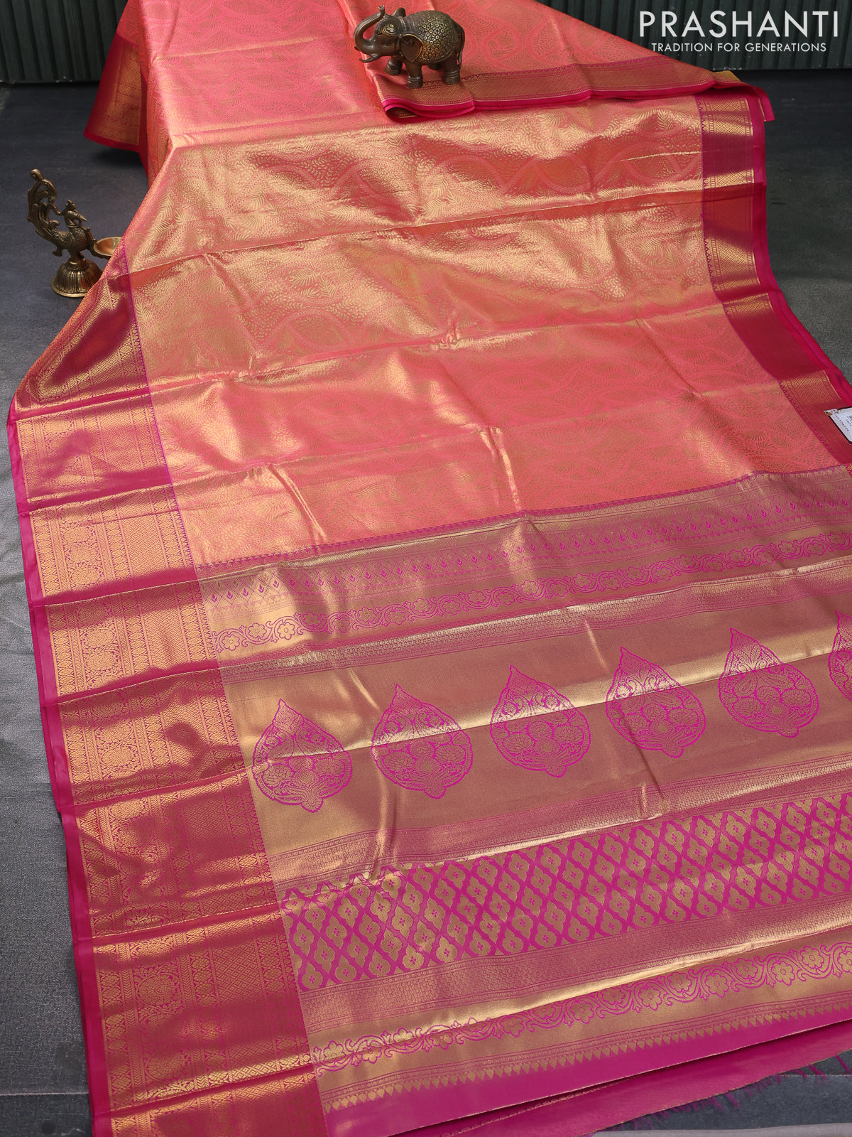 Bangalori tissue silk saree peach pink and pink with allover zari woven brocade weaves and long zari woven border