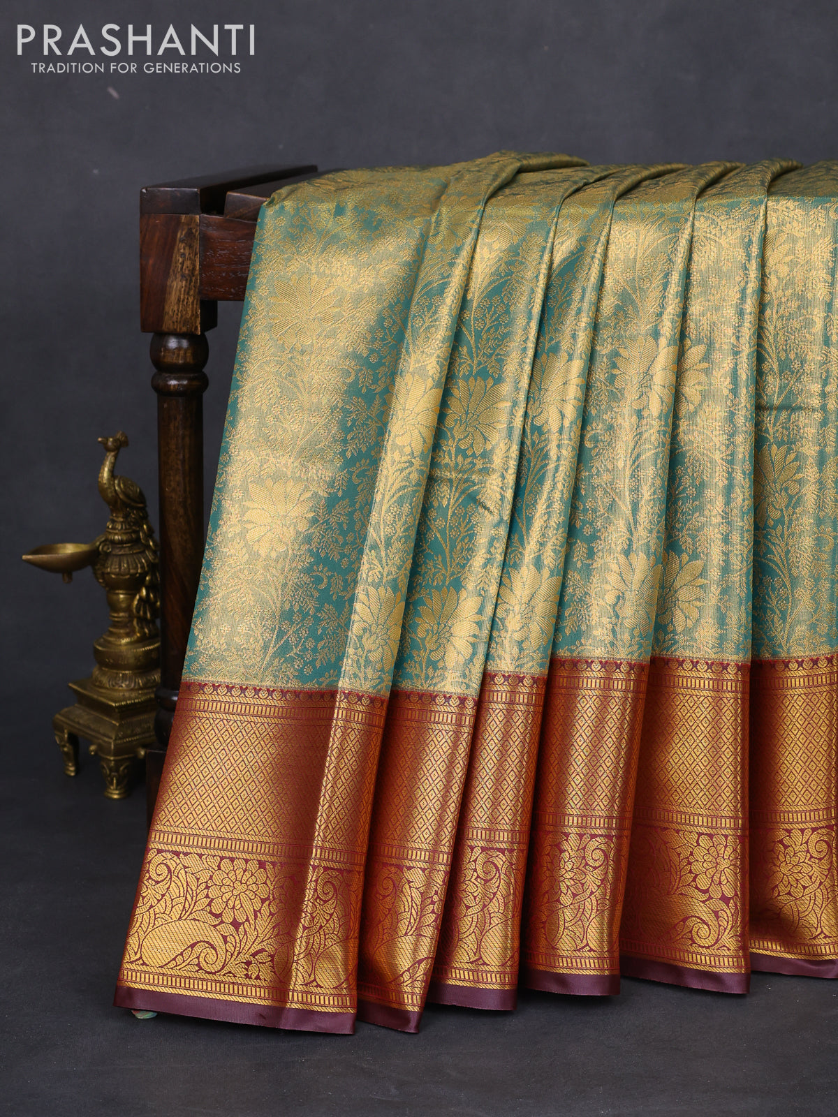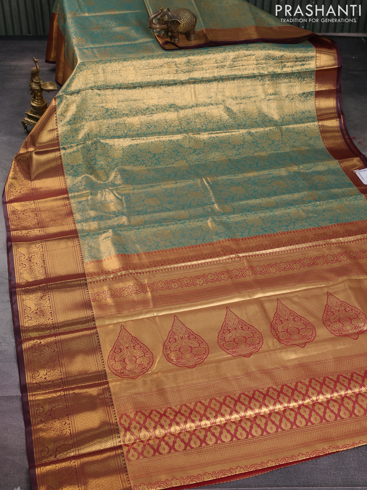 Bangalori tissue silk saree teal green and deep maroon with allover zari woven brocade weaves and long zari woven border