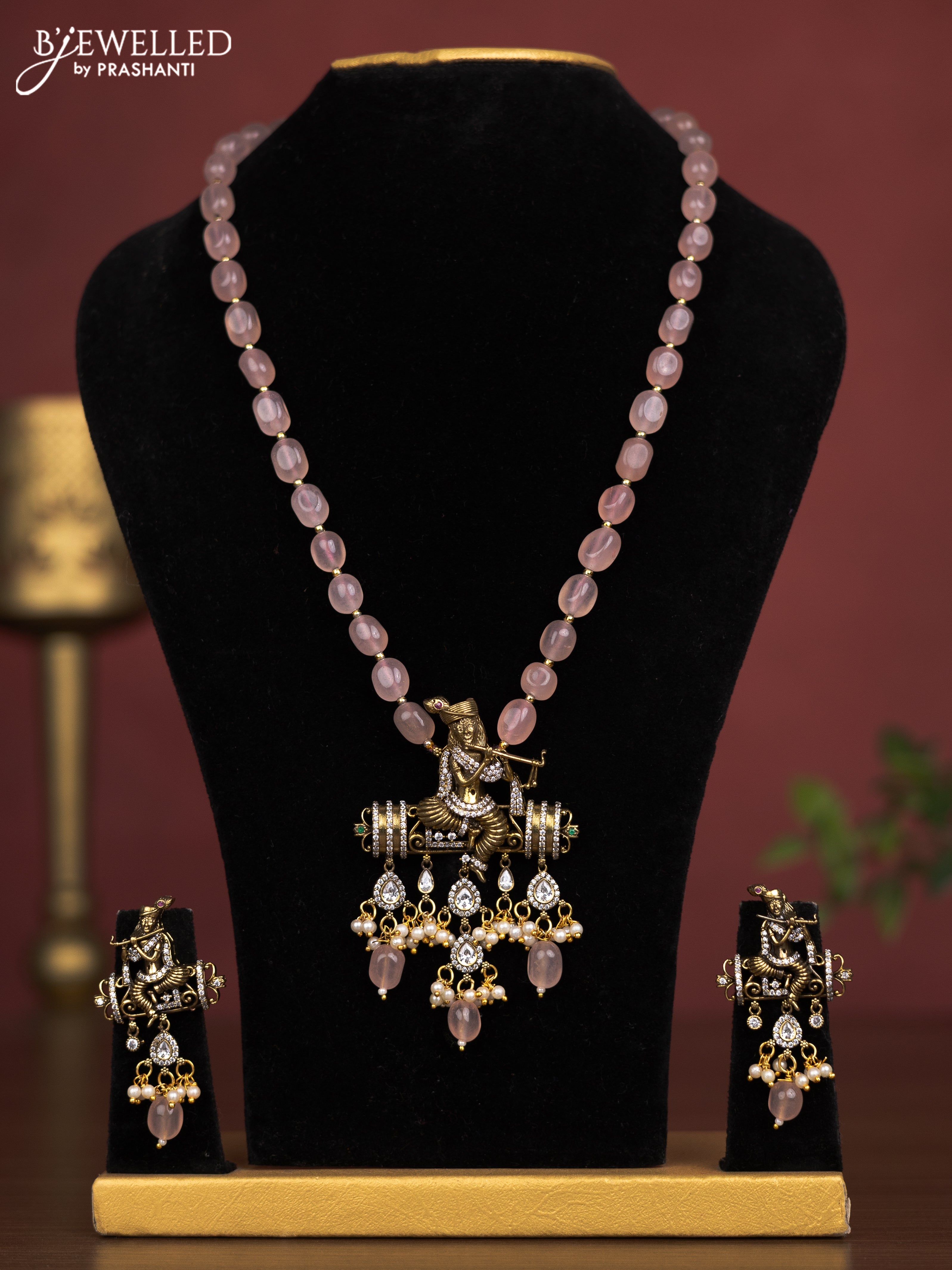 Beaded baby pink necklace krishna pendant with cz stones and pearl hangings