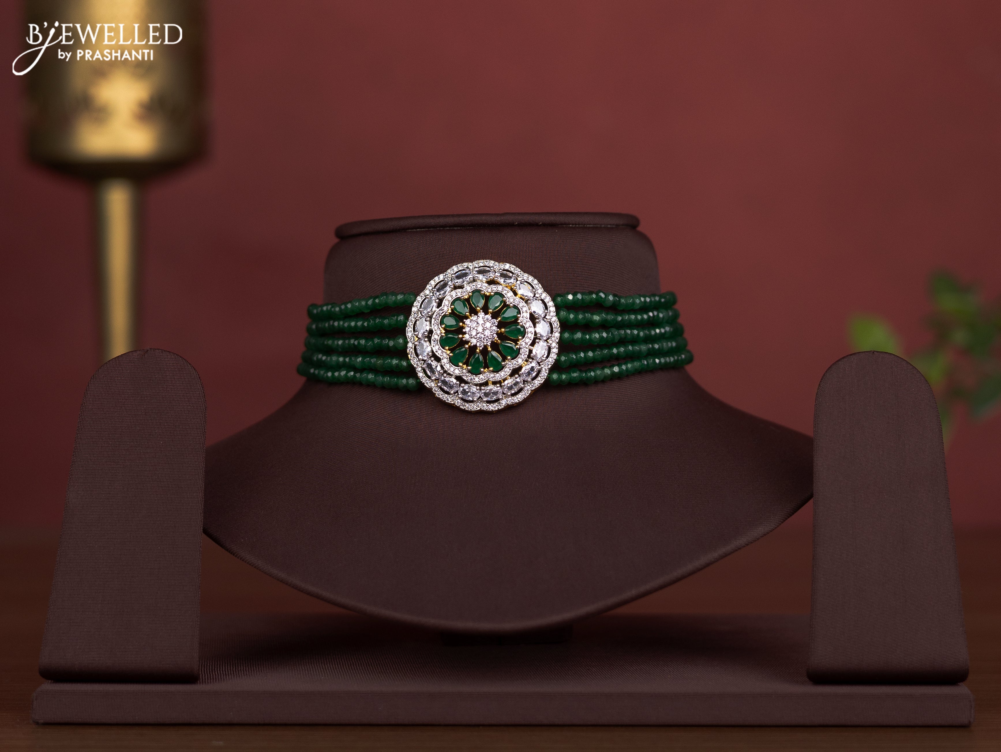 Beaded green choker with cz and emerald stones pendant without earring