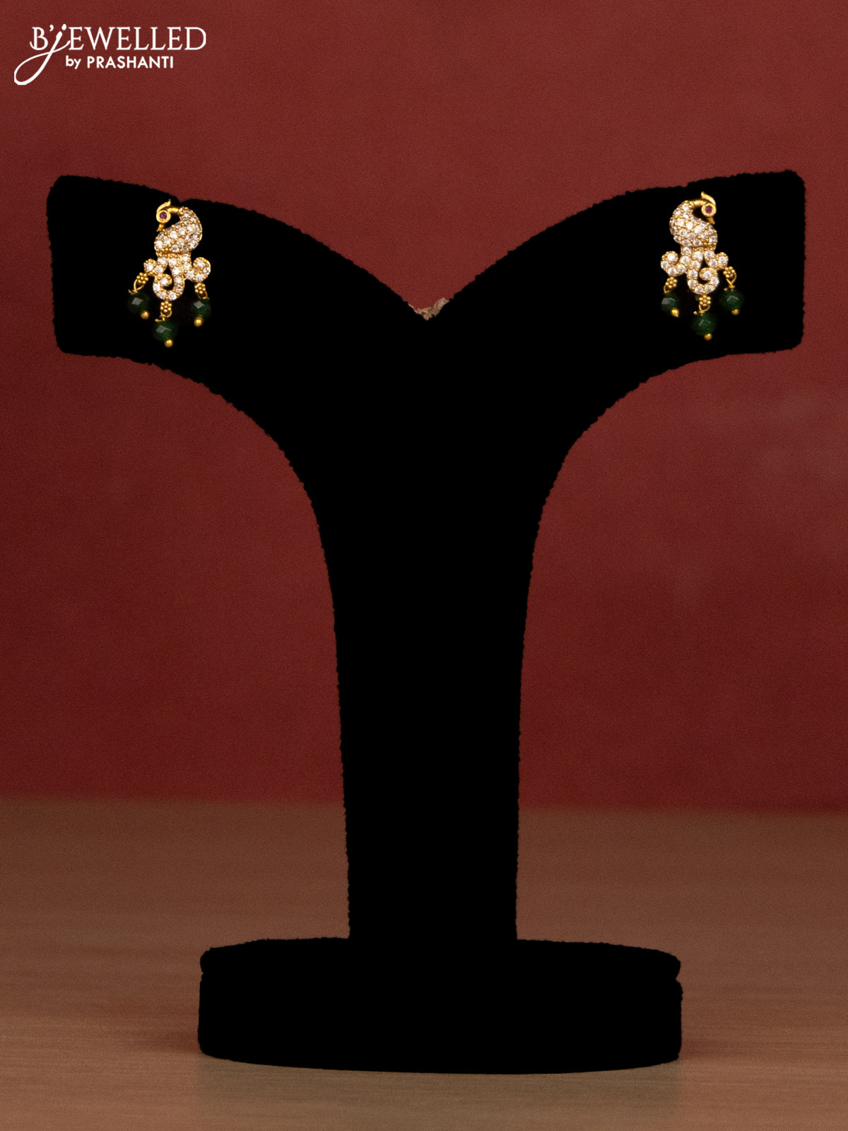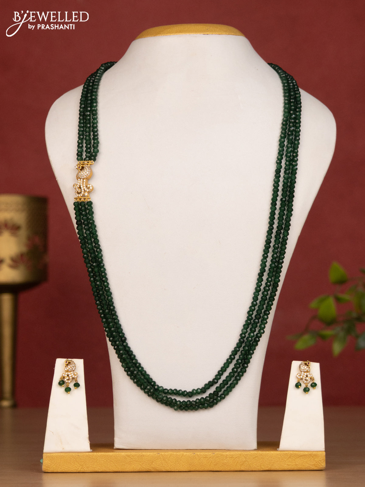 Beaded green haaram with peacock side pendant and cz stones