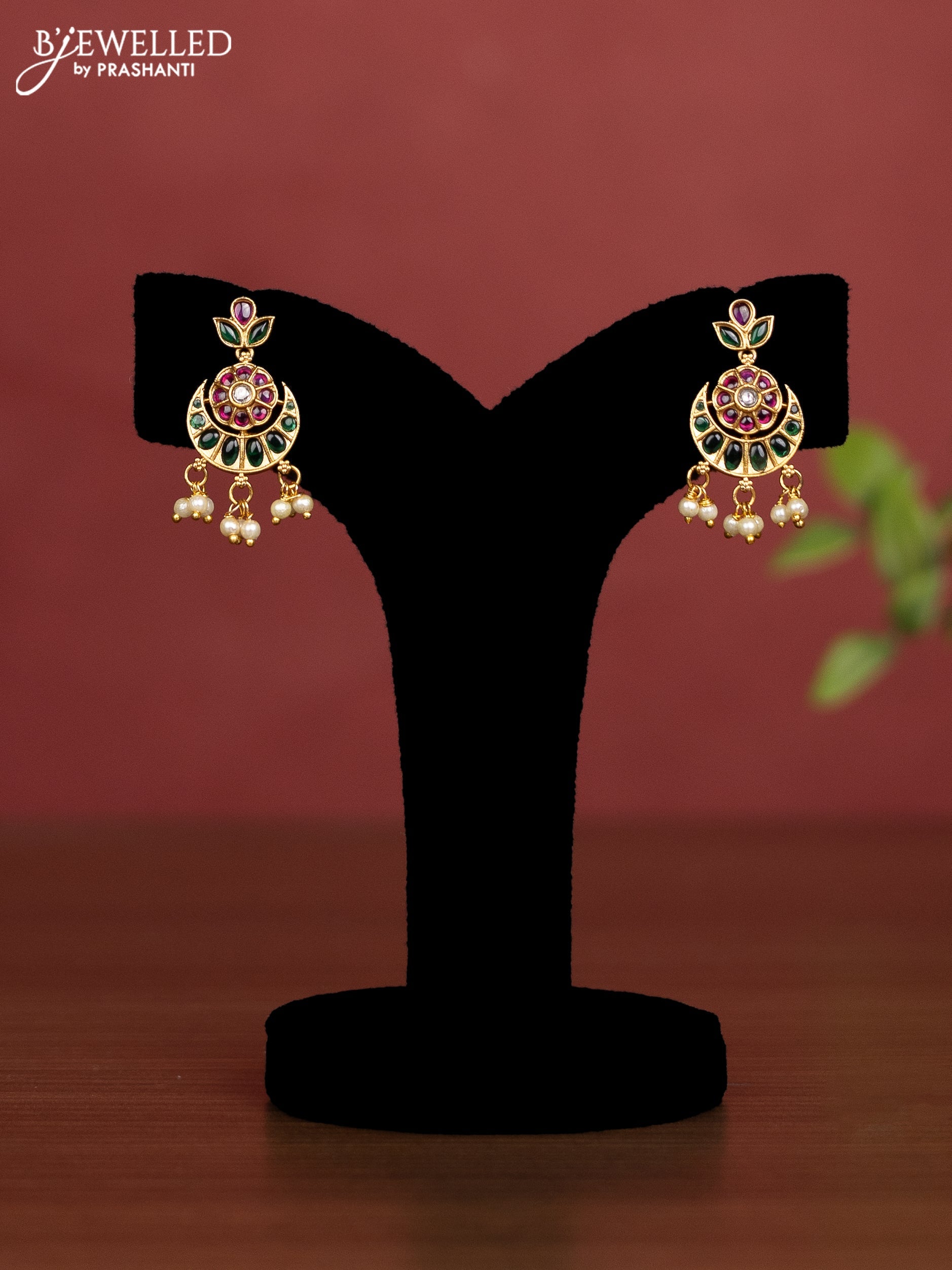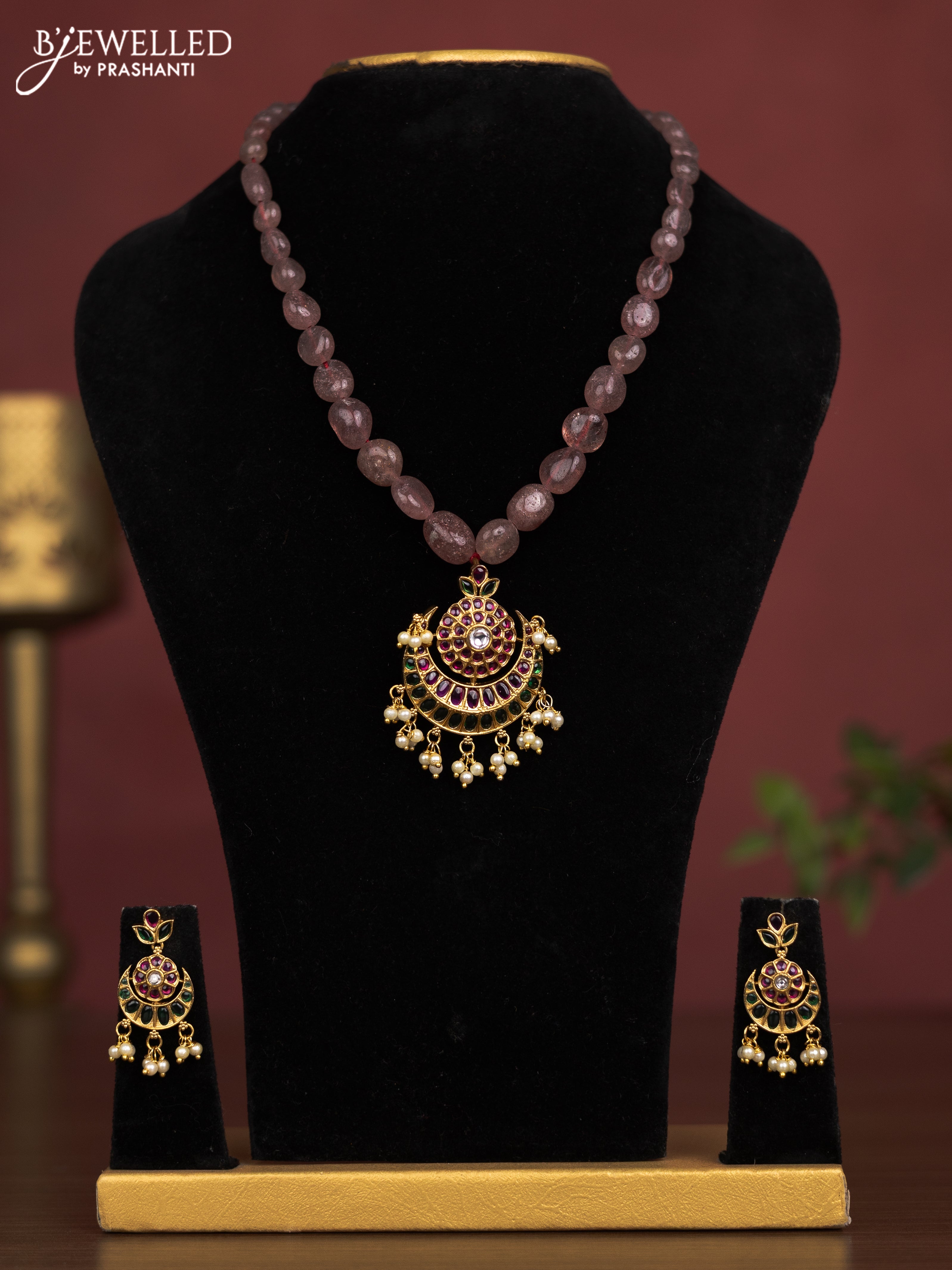 Beaded light brown necklace chandbali pendant with kemp & cz stones and pearl hangings