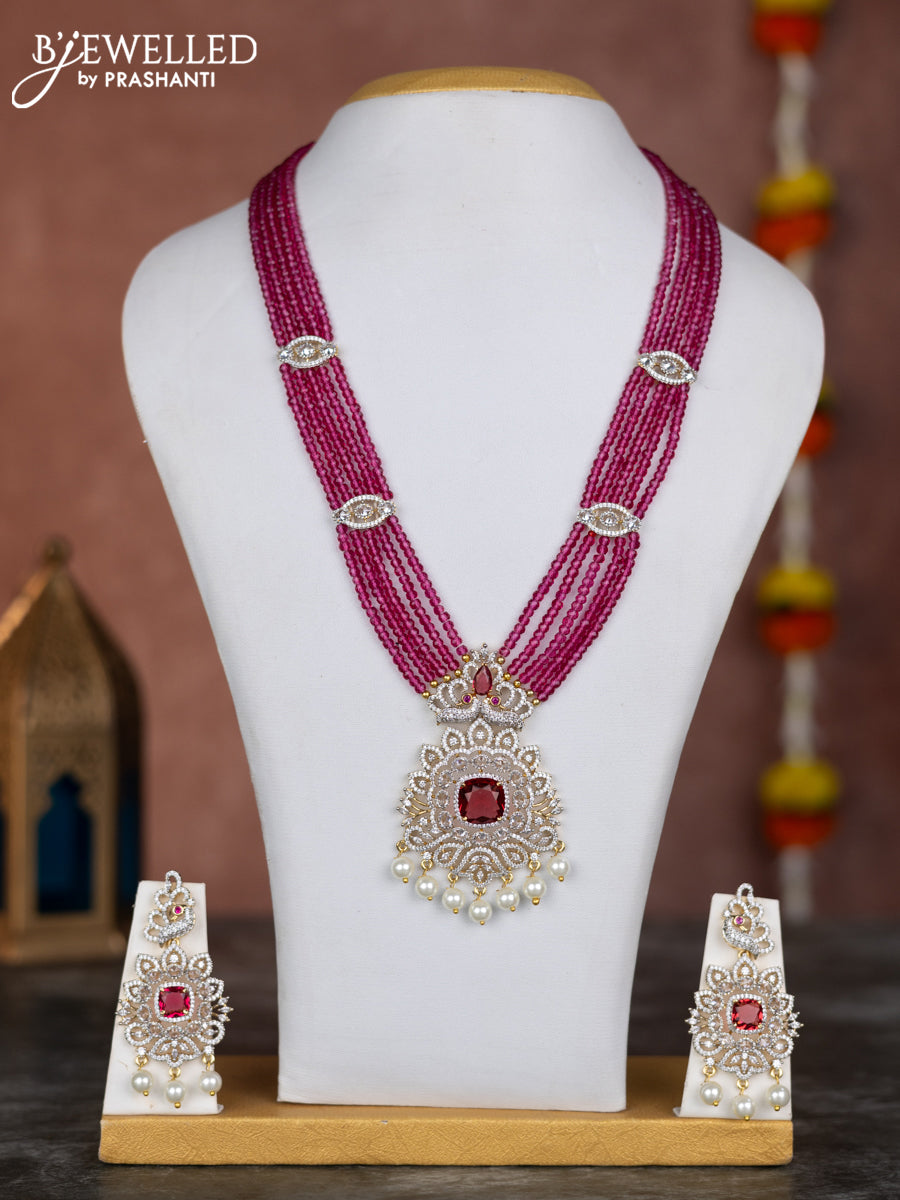 Beaded pink necklace with ruby & cz stones and pearl hangings in zircon finish