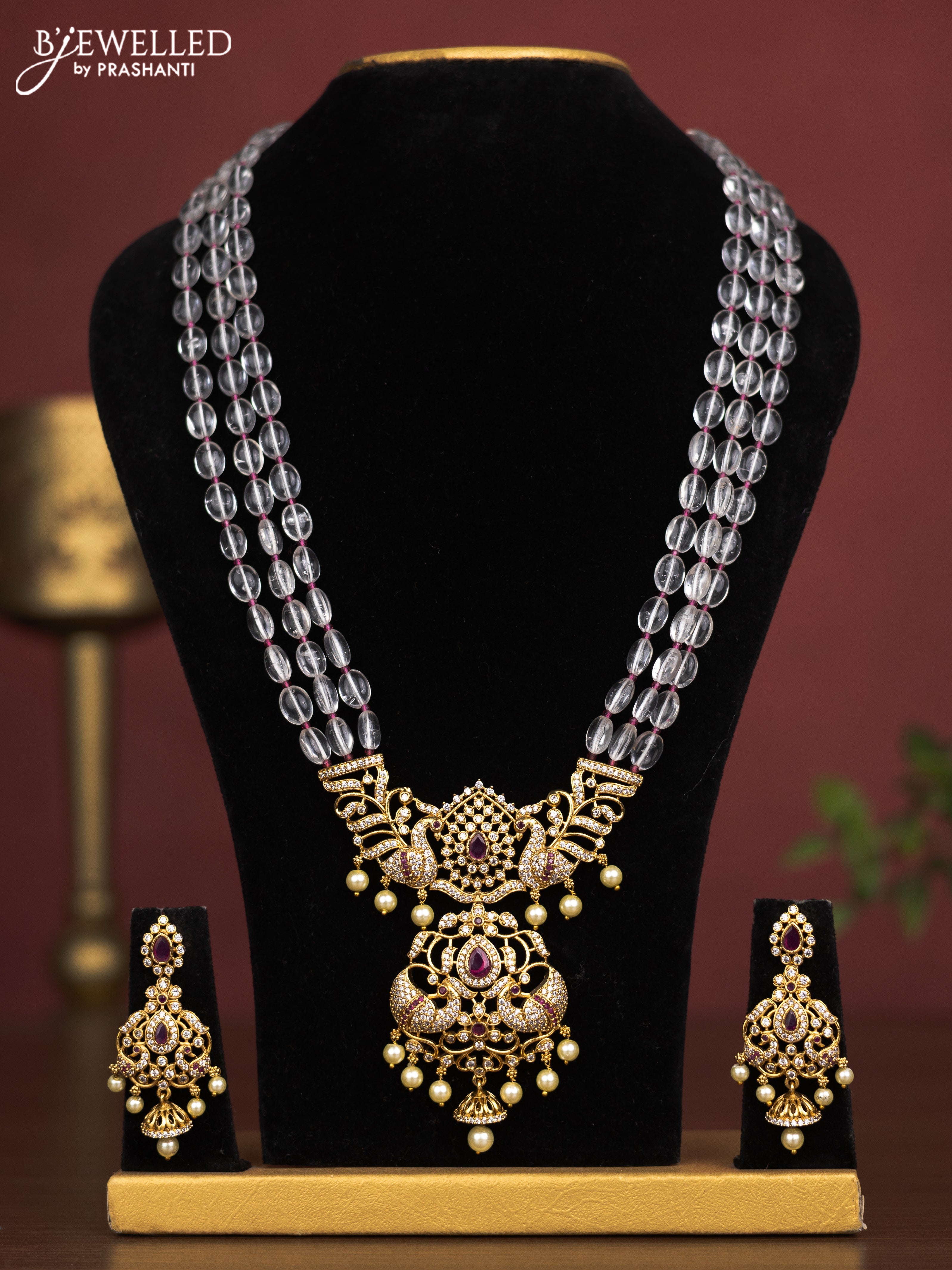 Beaded triple layer haaram with peacock pendant with pink kemp & cz stones and pearl hangings