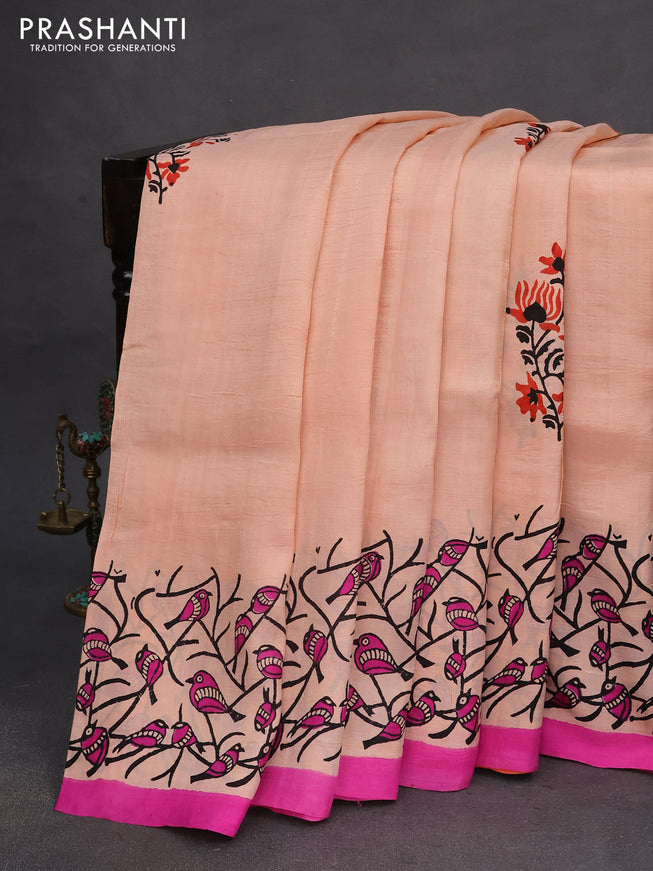 Bishnupuri silk saree peach pink and red blue with butta prints and printed border