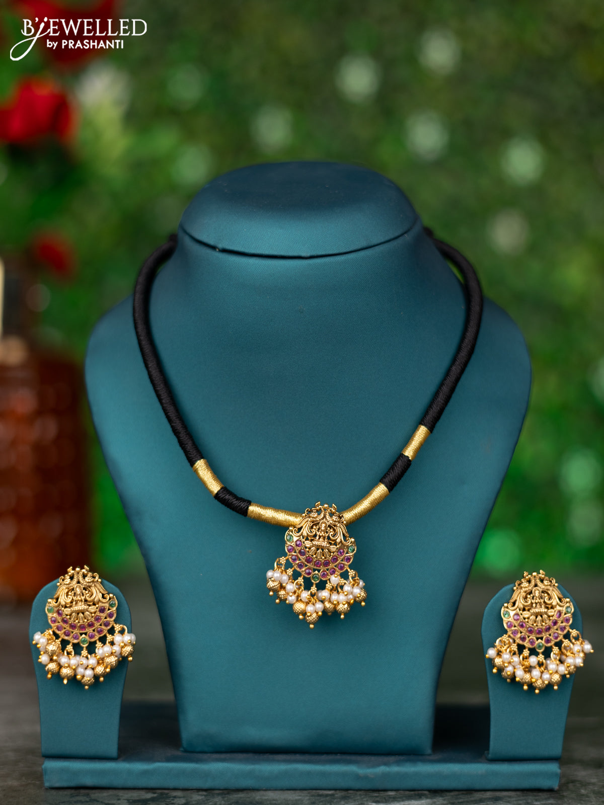 Black thread necklace lakshmi design with kemp stones and pearl & golden beads hangings