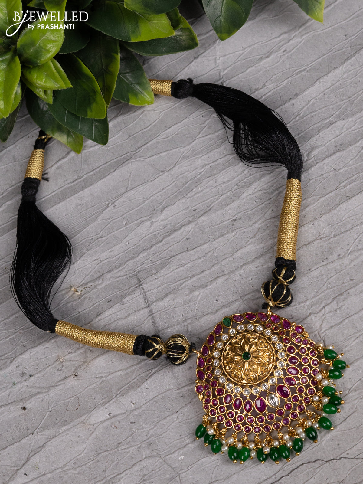 Black thread necklace with kemp & cz stone and beads hangings without earring