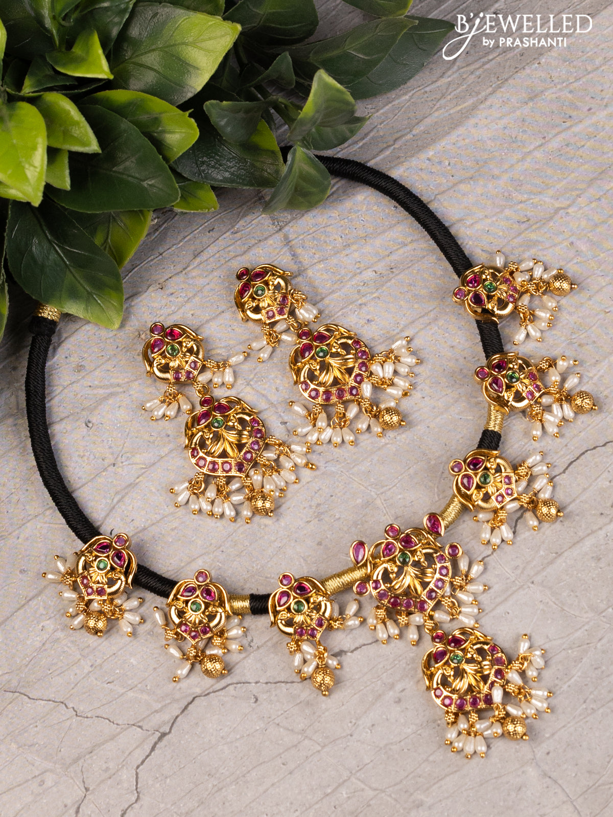 Black thread necklace with kemp stones and pearl & golden beads hanging