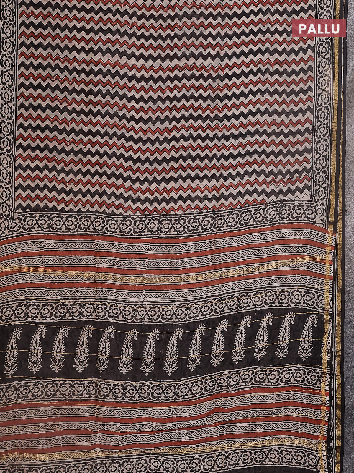 Chanderi bagru saree beige and black with allover zig zag prints and small zari woven border