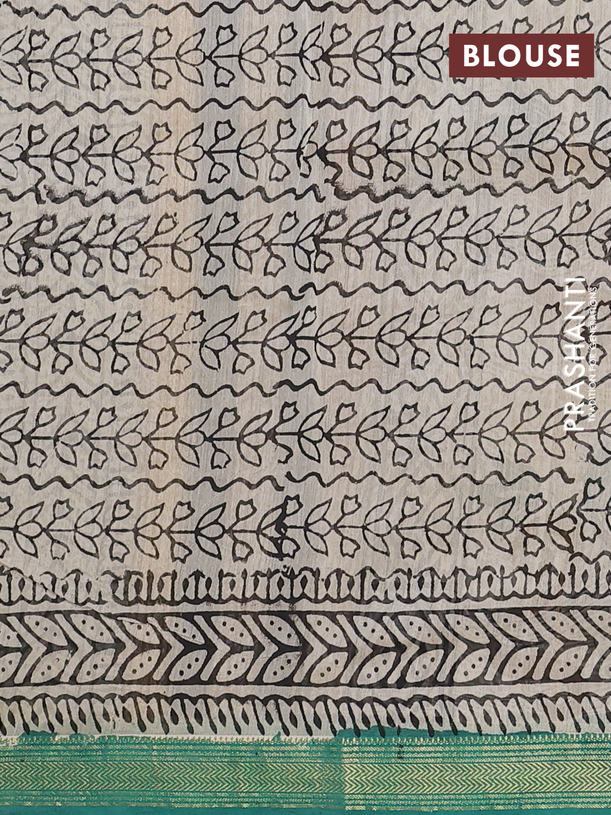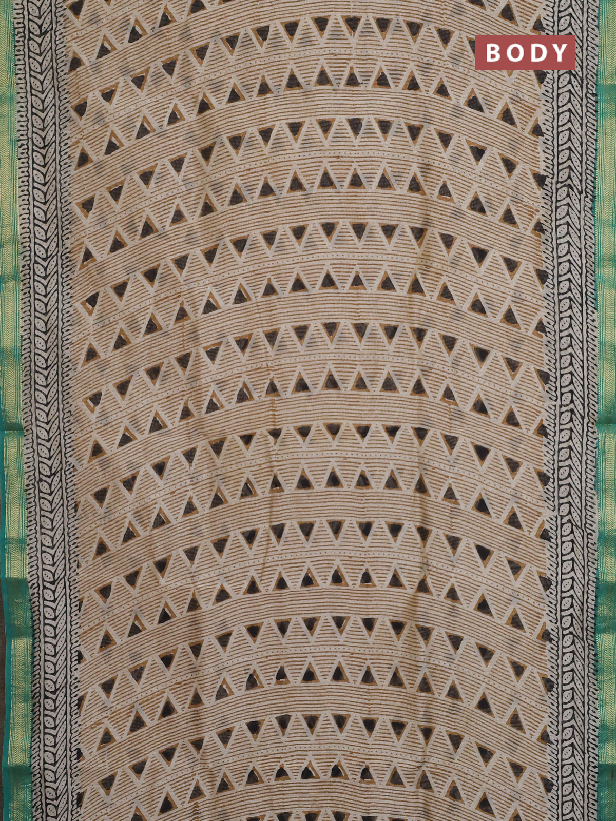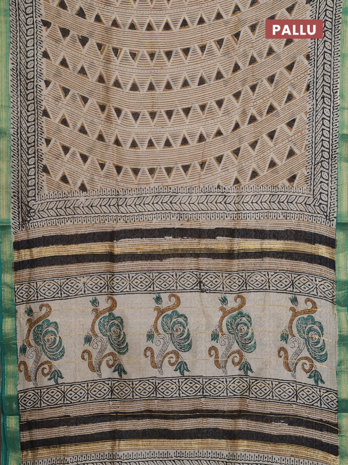 Chanderi bagru saree beige and teal green with allover geometric prints and maheshwari border