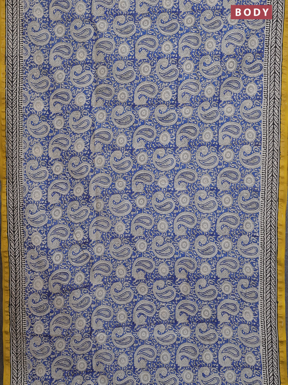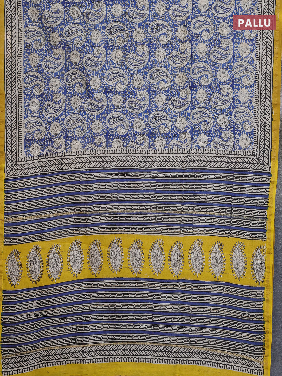 Chanderi bagru saree blue and yellow with allover paisley prints and small zari woven border