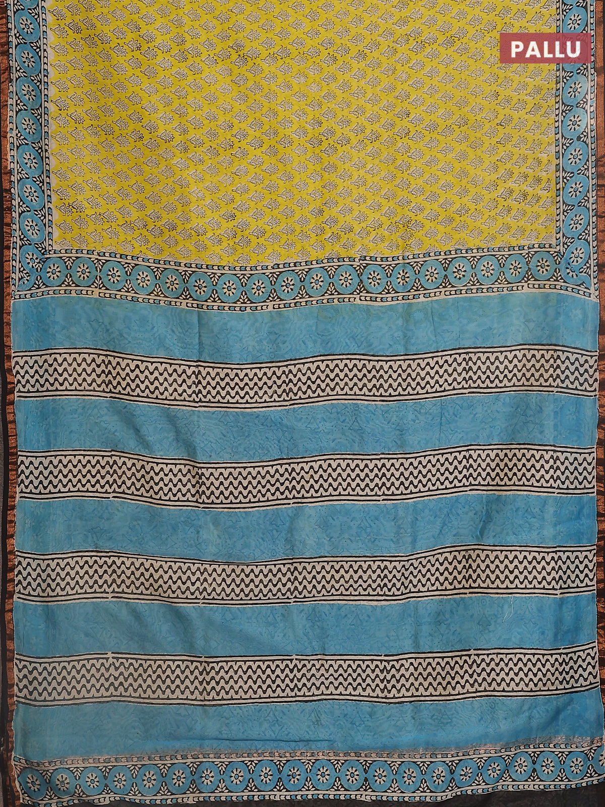 Chanderi bagru saree lime yellow and blue black with allover butta prints and small zari woven border