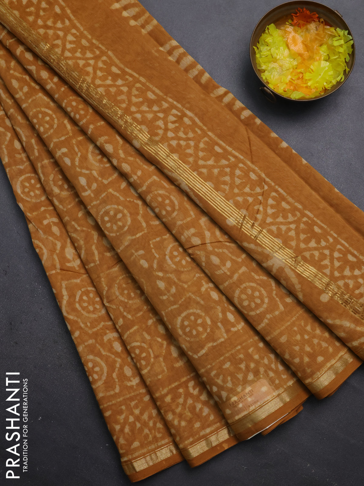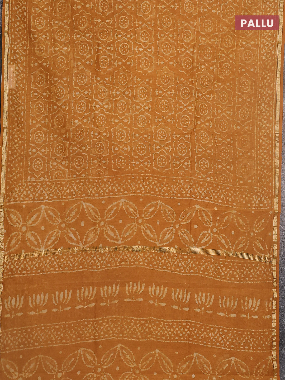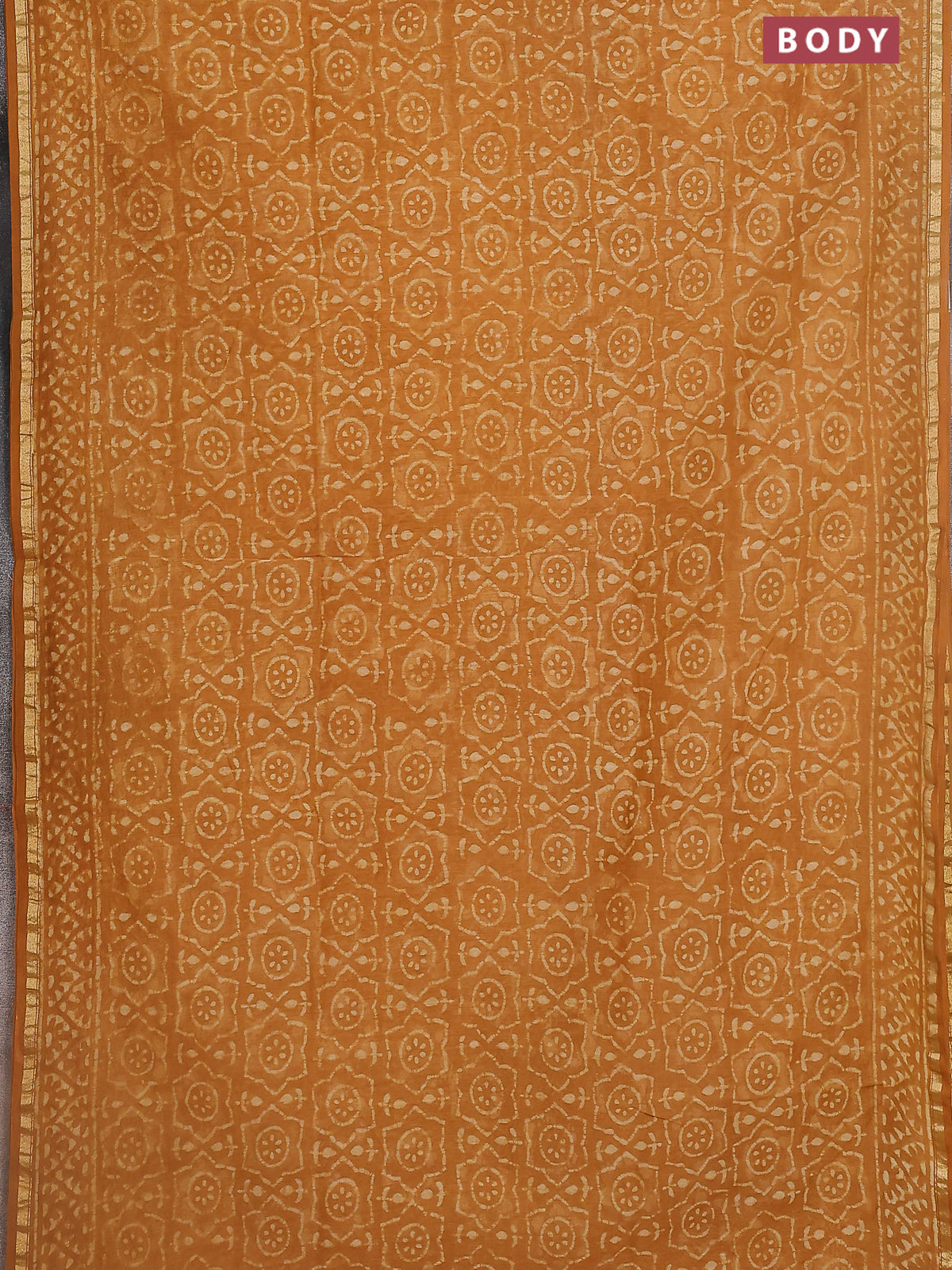 Chanderi bagru saree mustard yellow with allover dabu prints and small zari woven border