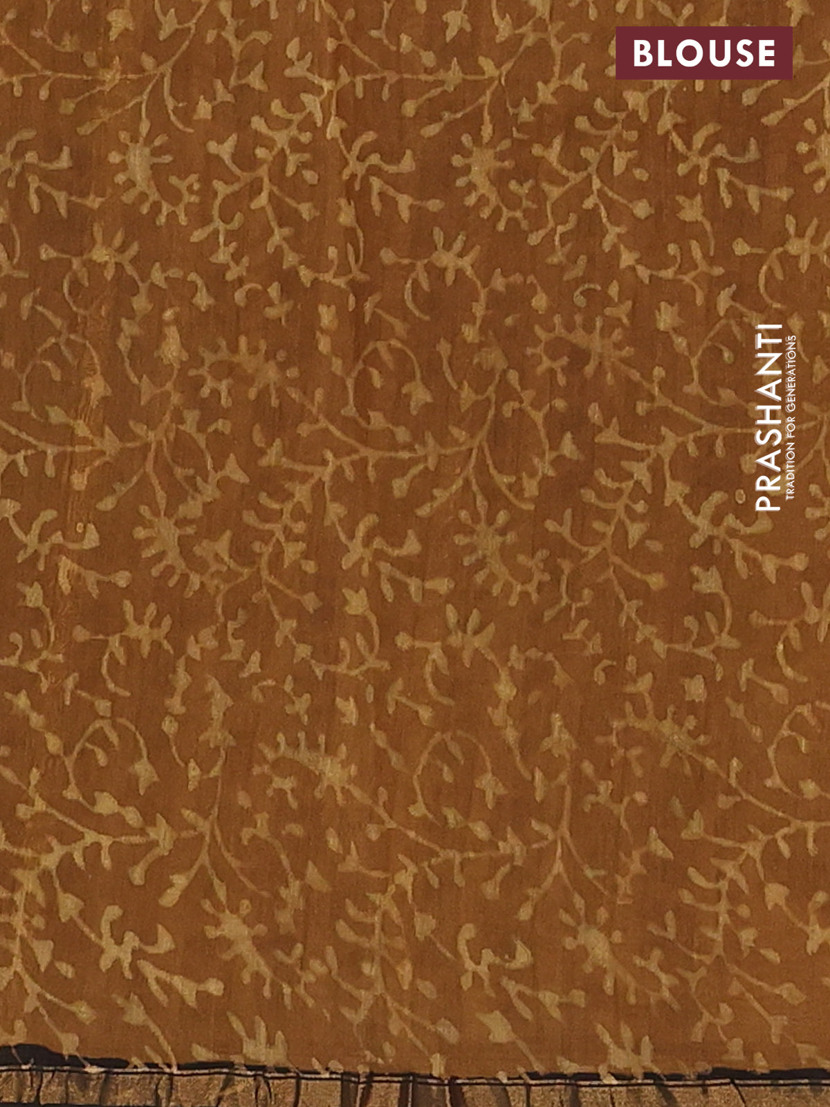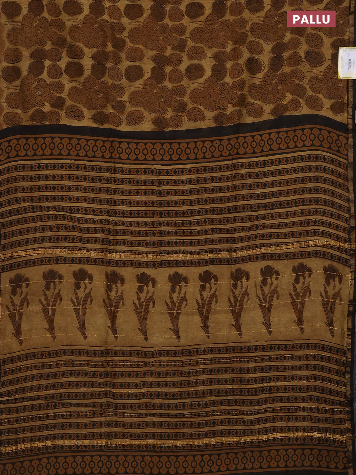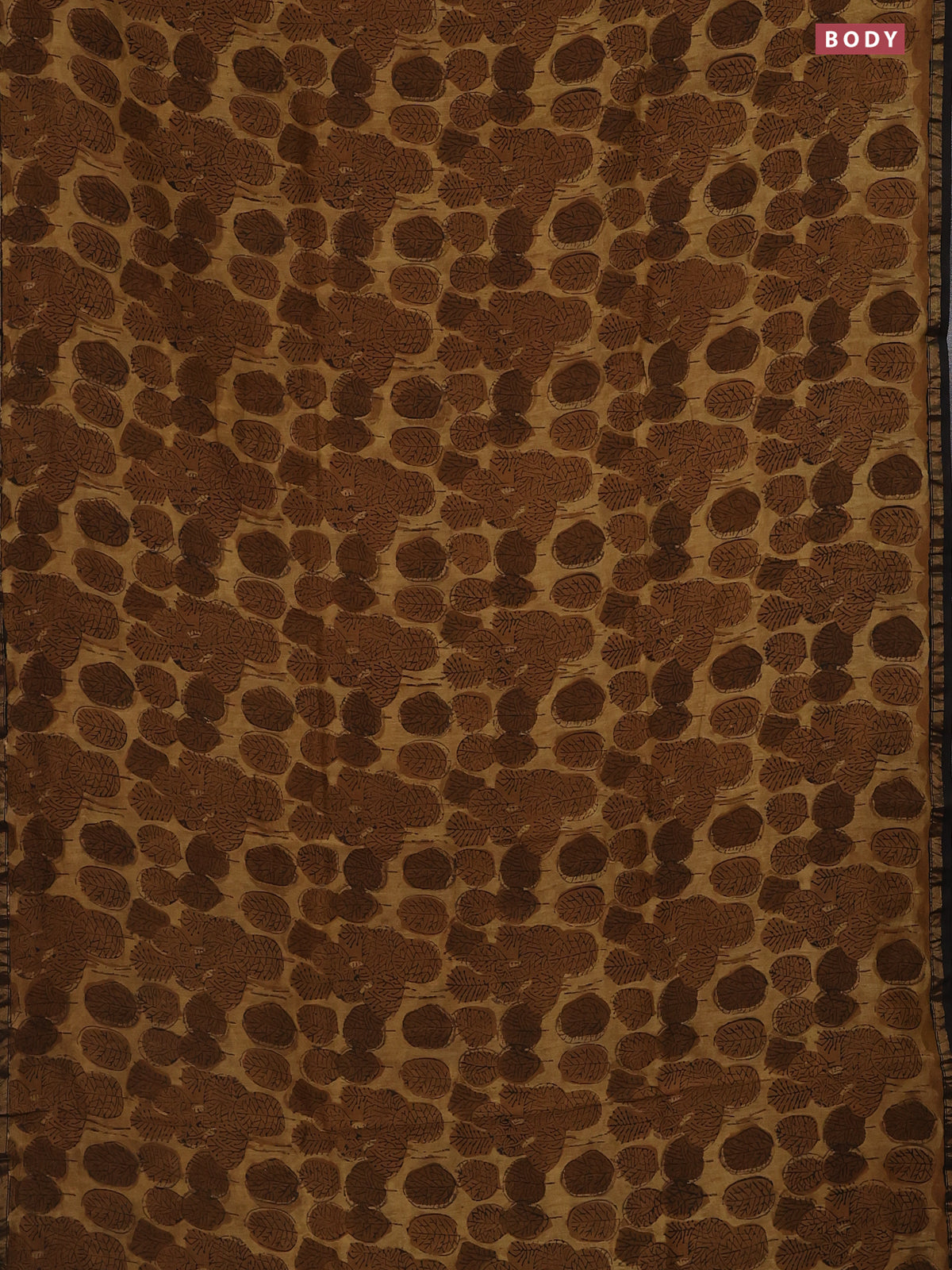 Chanderi bagru saree sandal and brown with allover leaf prints and small zari woven border