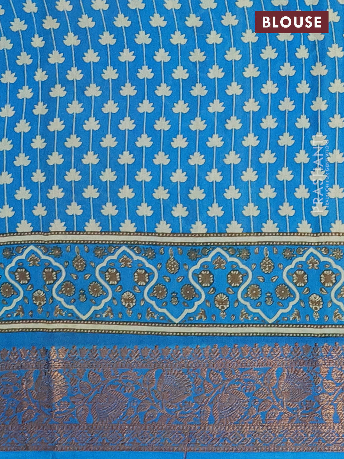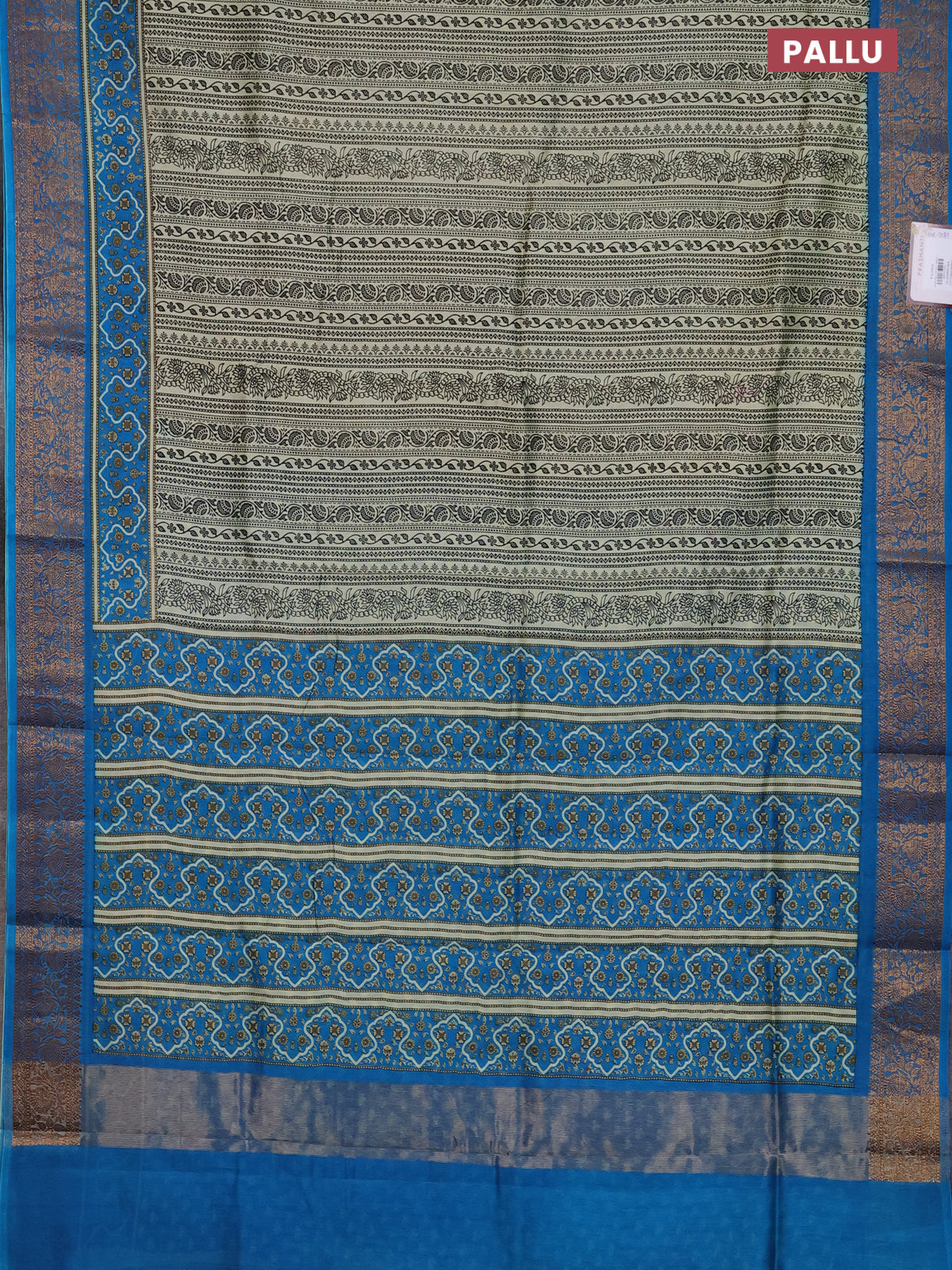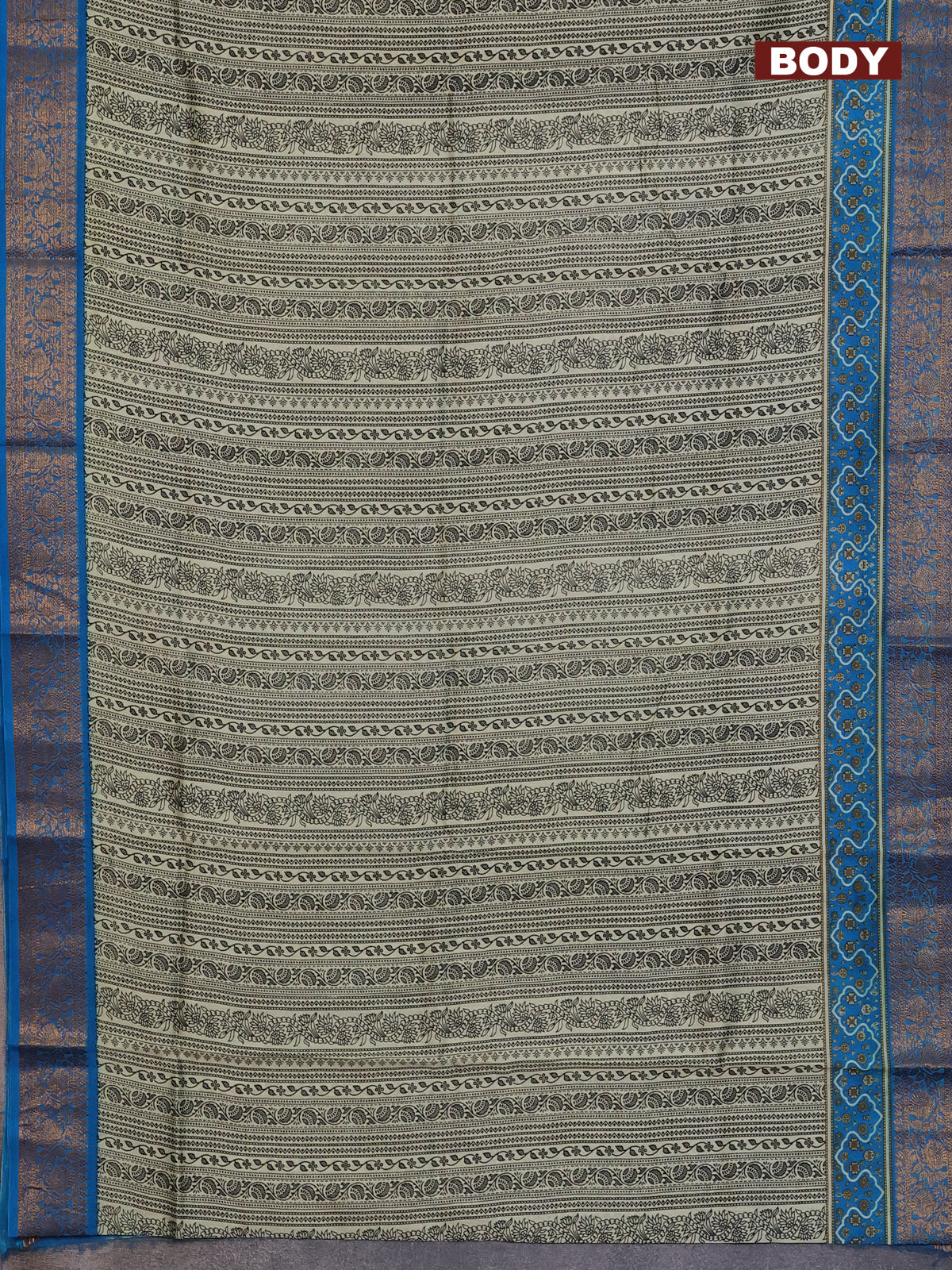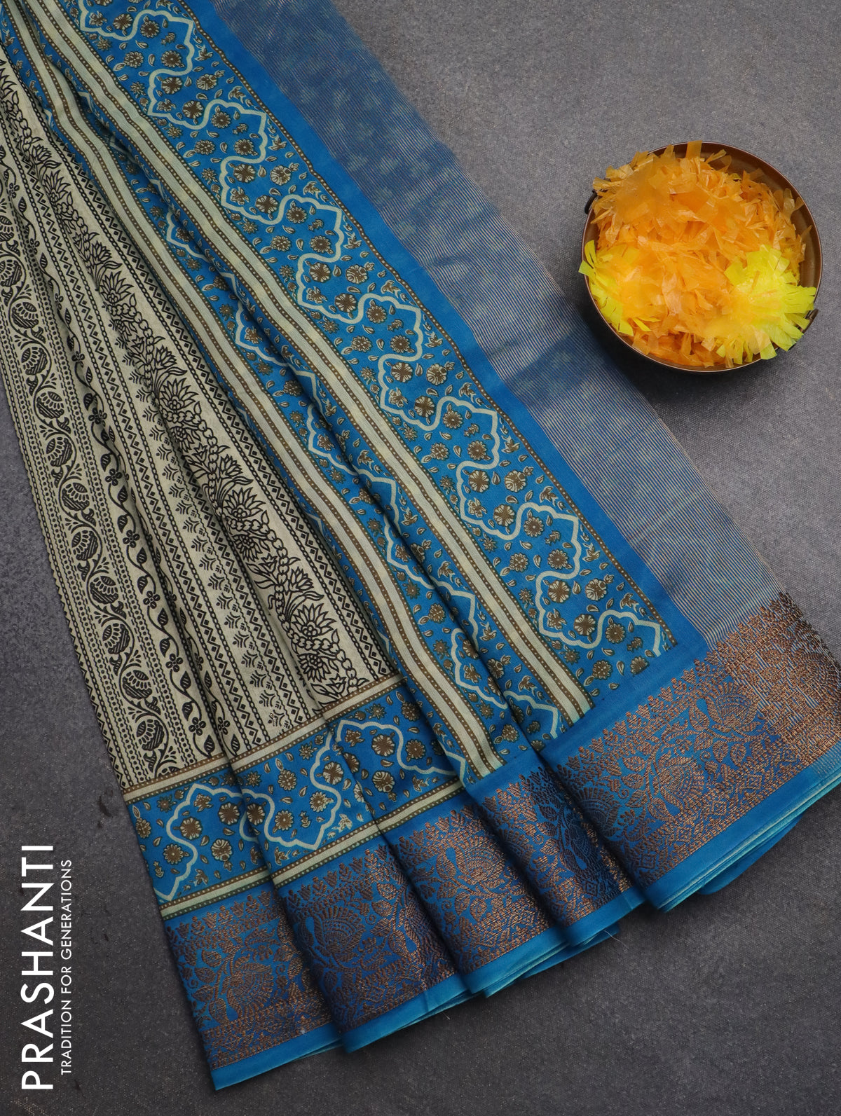 Chanderi silk cotton saree cream and cs blue with allover prints and banarsi style border