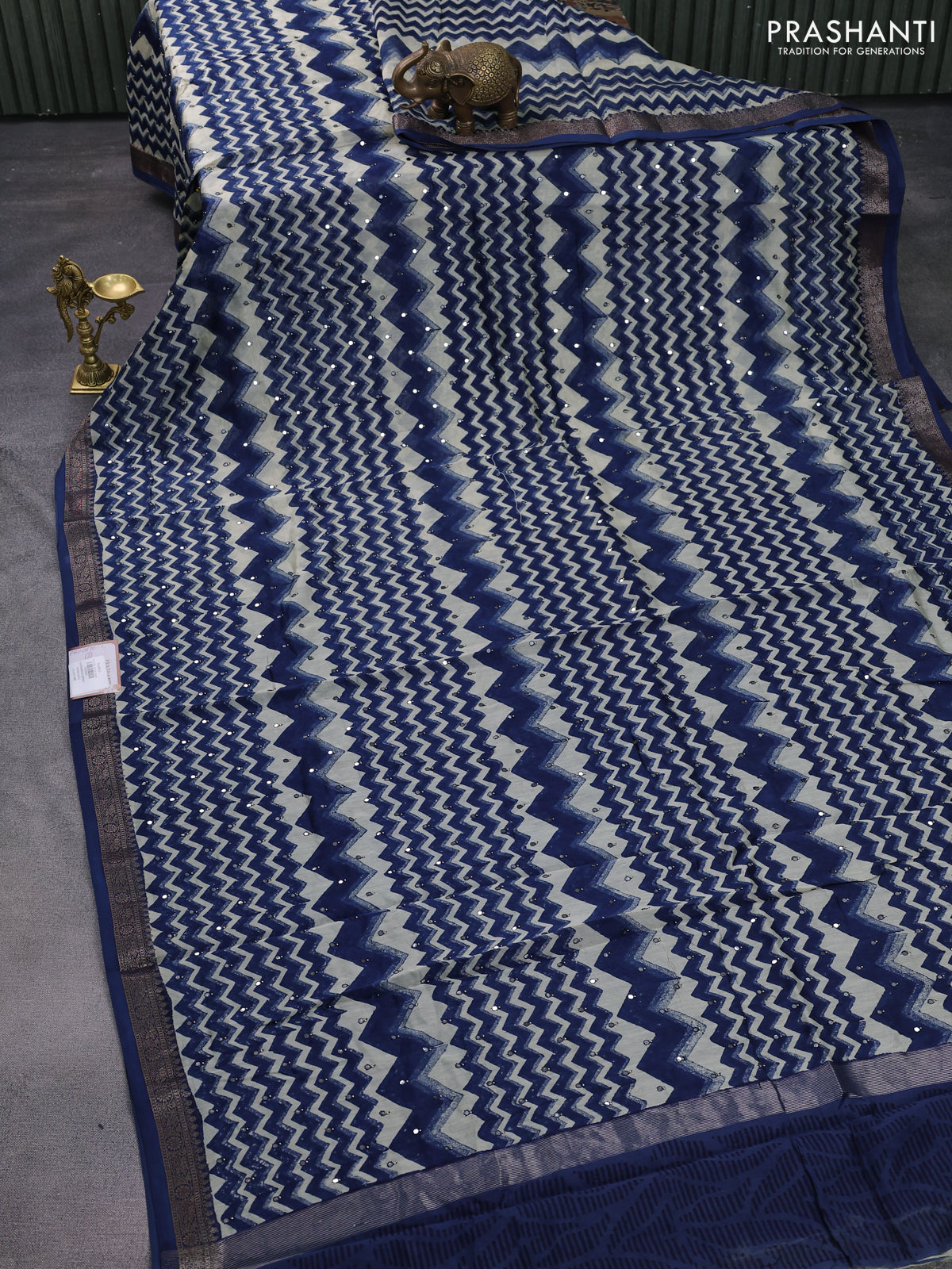 Chanderi silk cotton saree dark blue and beige with allover zig zag prints & mirror work and woven border