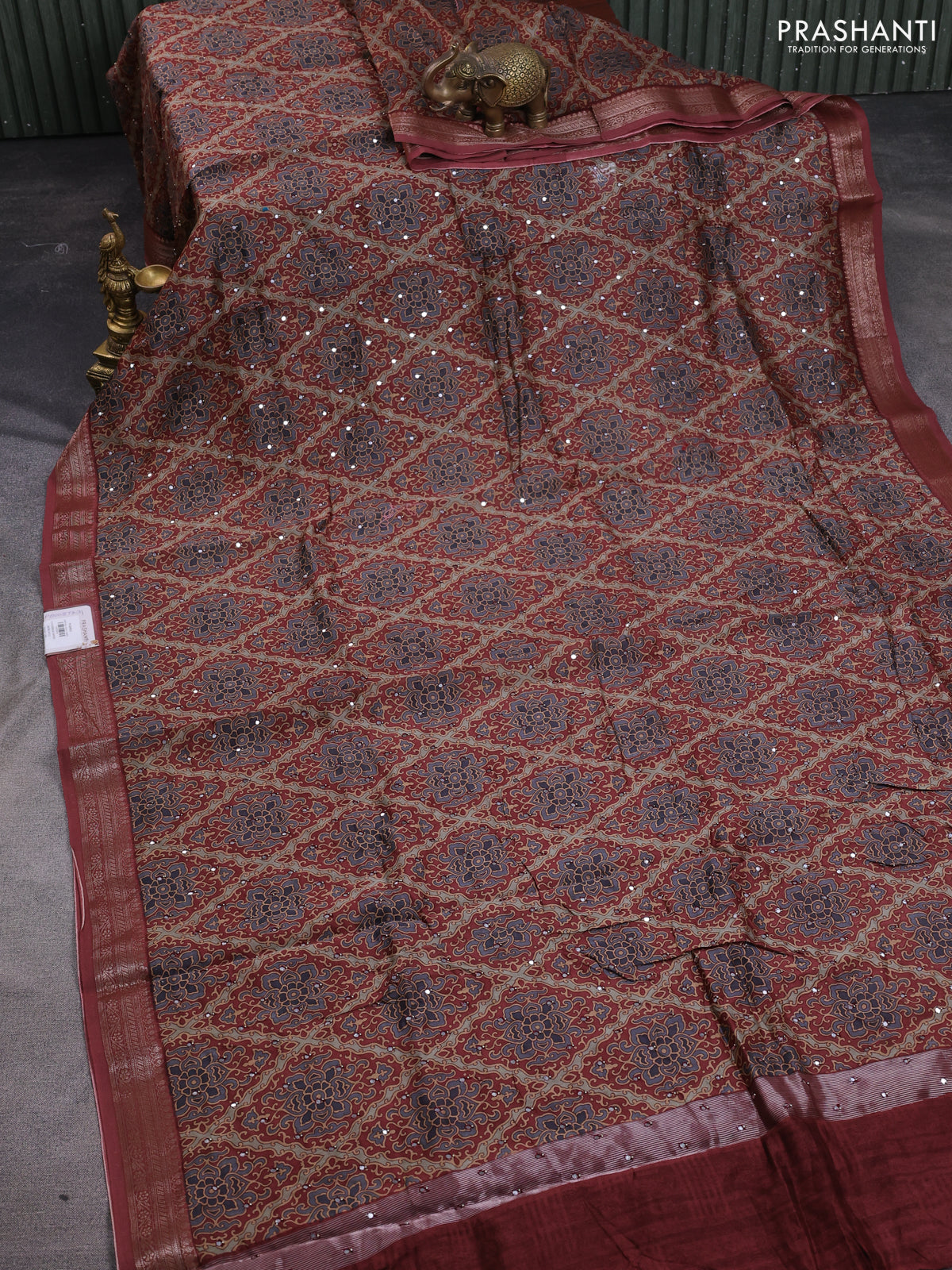 Chanderi silk cotton saree pastel maroon with allover prints & mirror work and woven border
