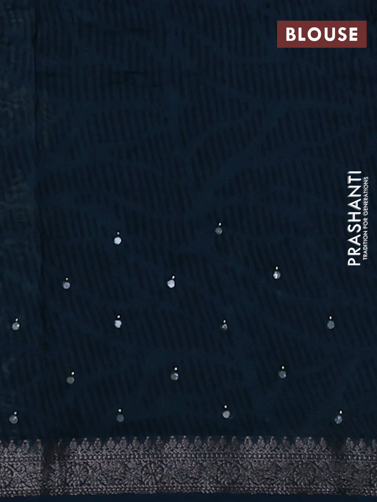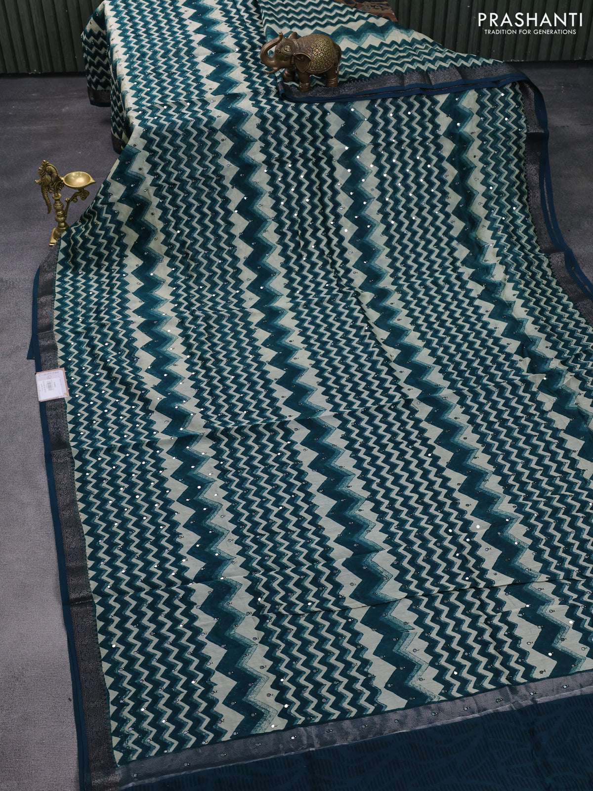 Chanderi silk cotton saree peacock green and beige with allover zig zag prints & mirror work and woven border