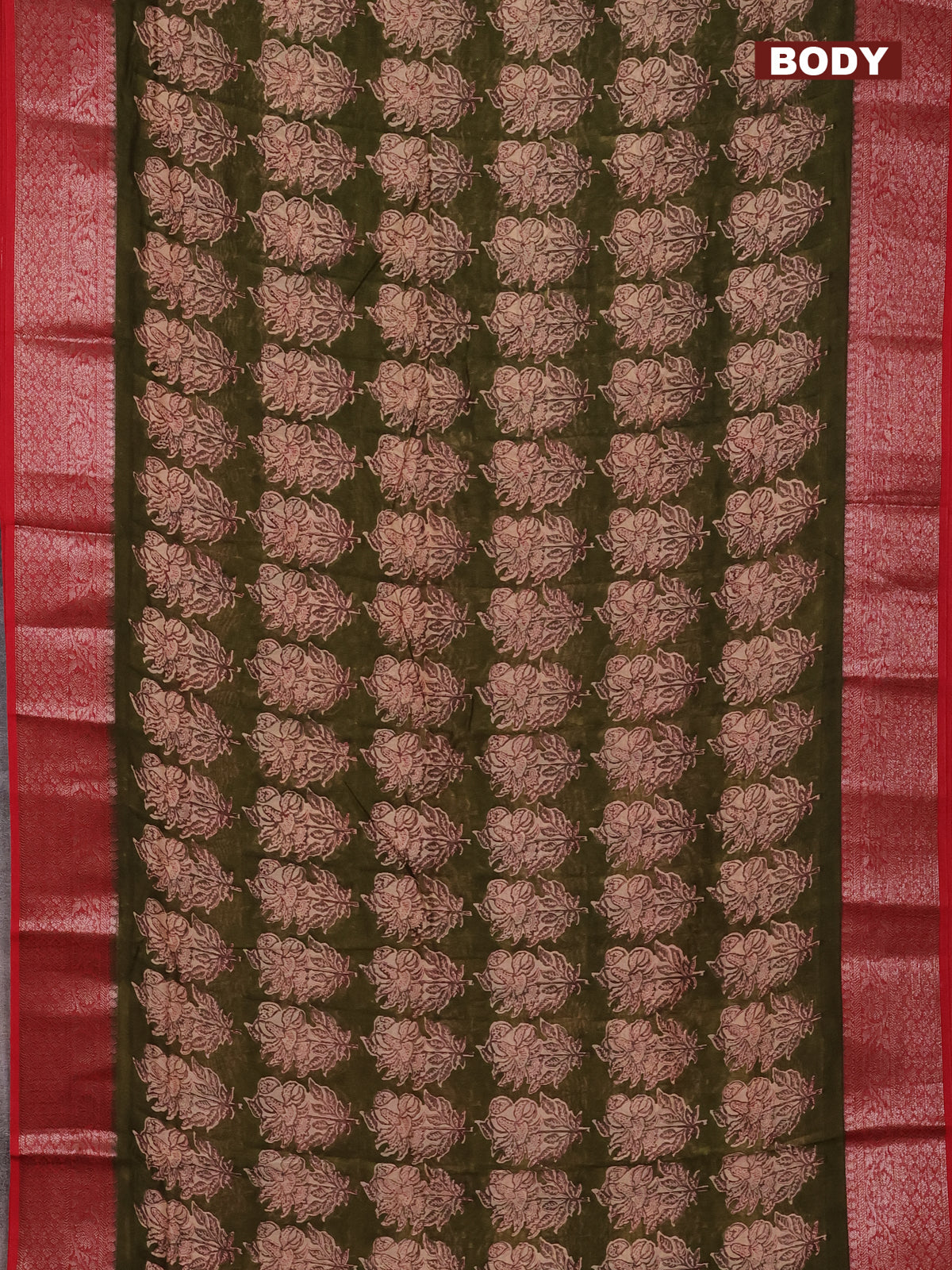 Chanderi silk cotton saree sap green and red witha allover floral butta prints and banarasi style border