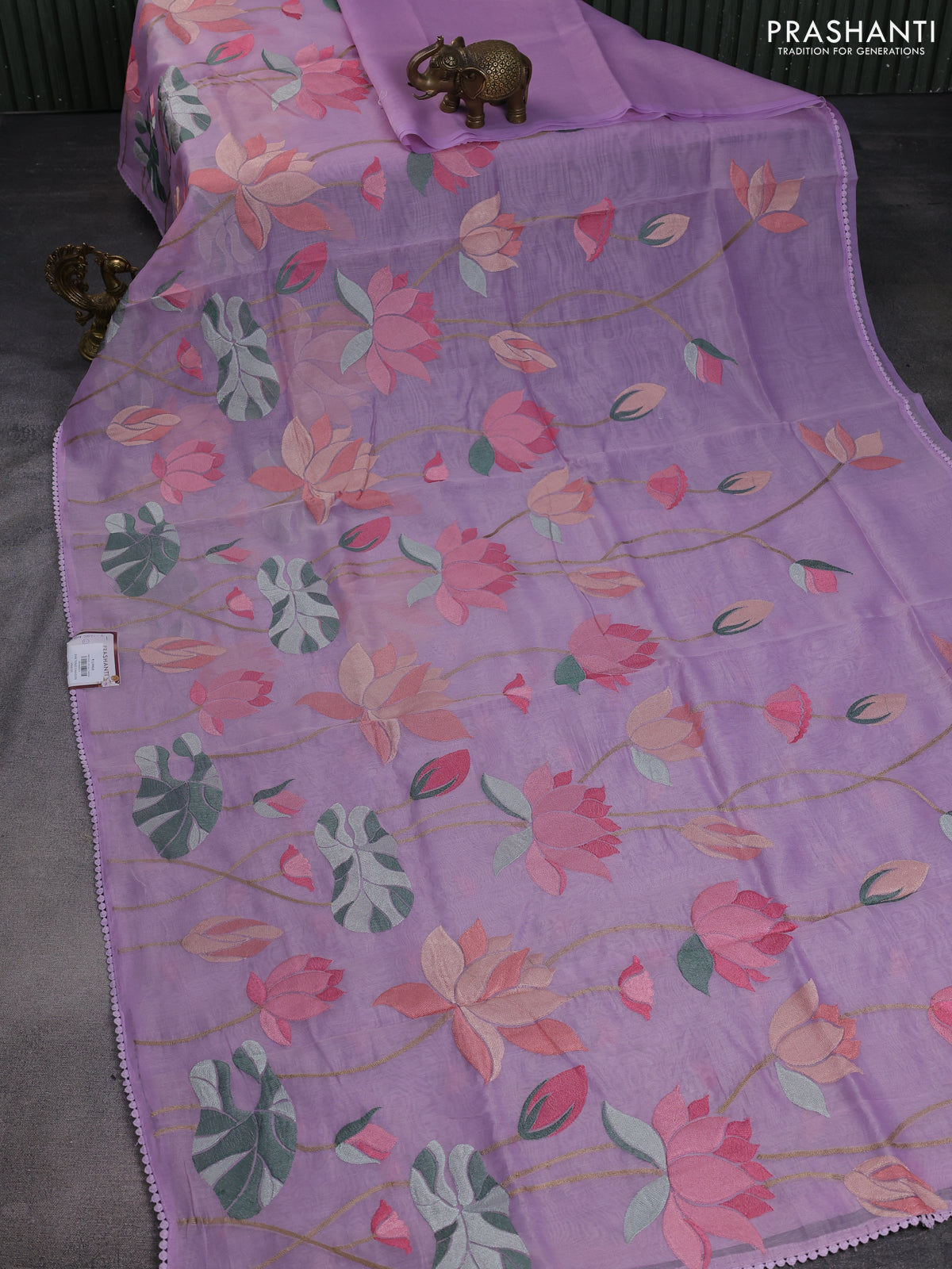 Chanderi tissue saree lavender with allover floral embroidery and lace work border