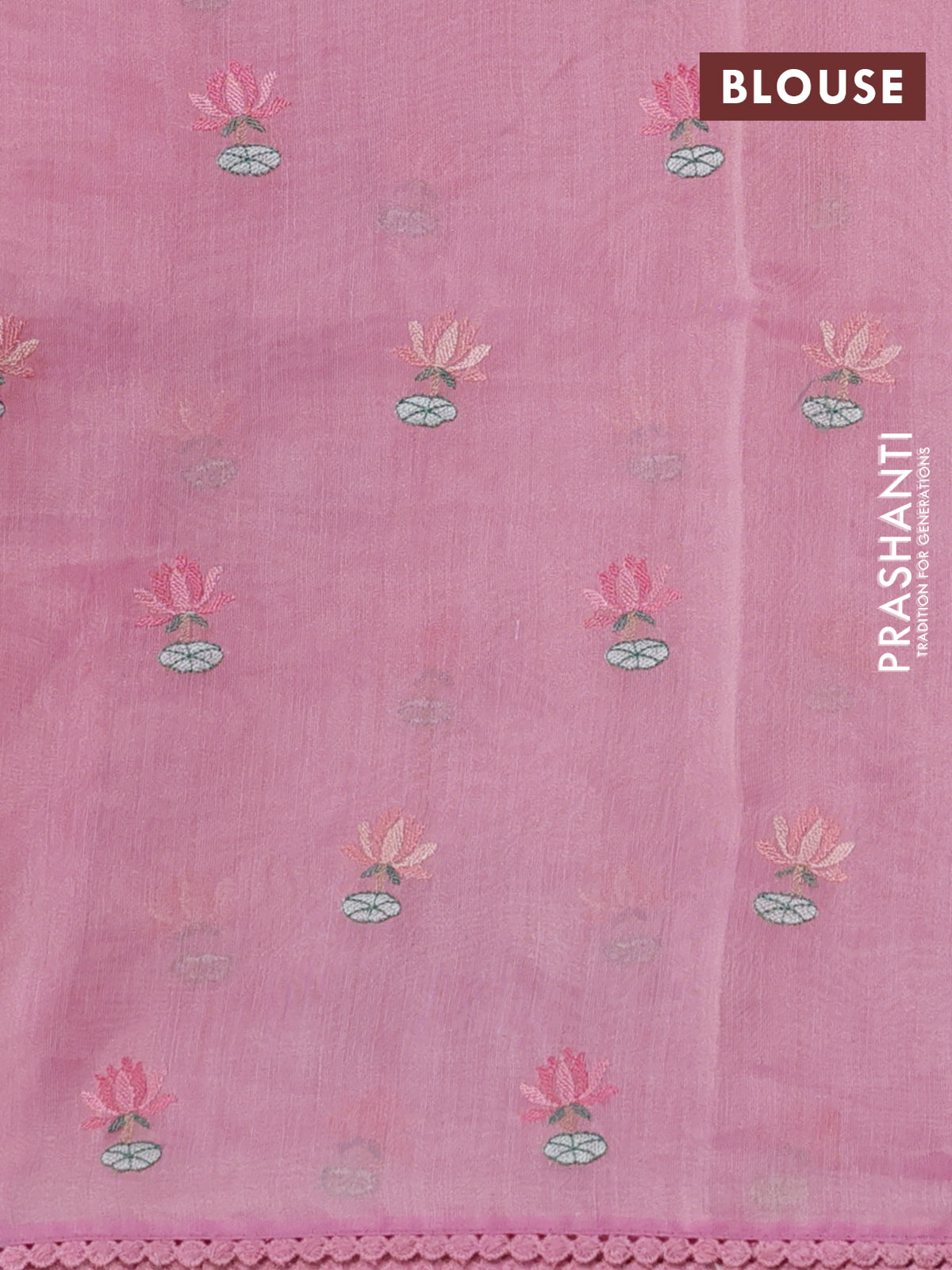 Chanderi tissue saree peach pink with allover floral embroidery and lace work border