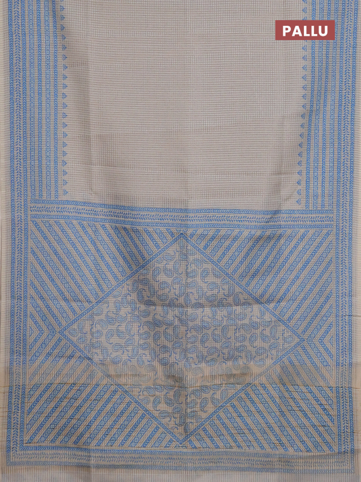 Chappa saree beige and cs blue with allover small zari checked pattern and printed border