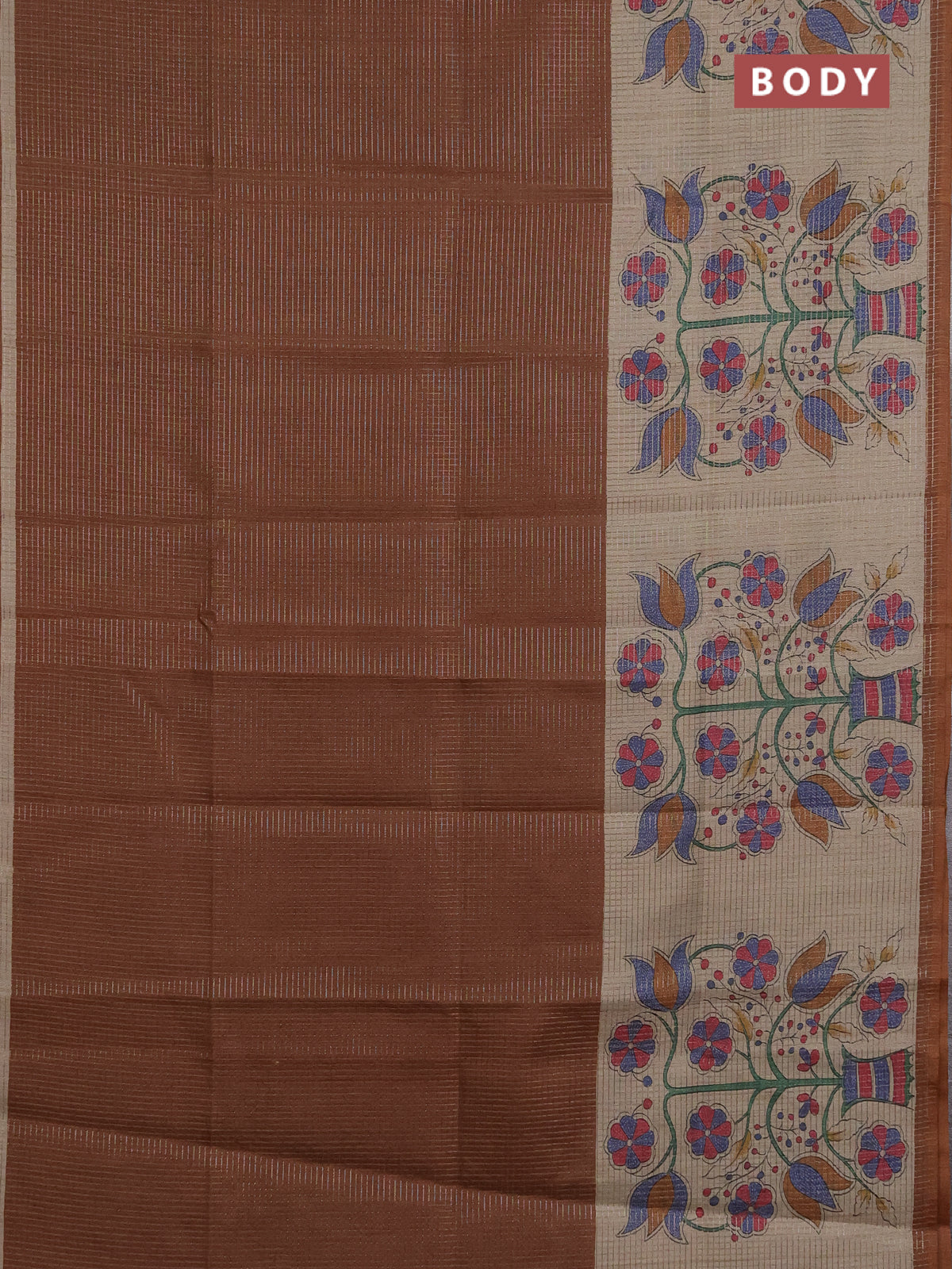 Chappa saree brown and beige with allover small zari checked pattern and floral digital printed pallu