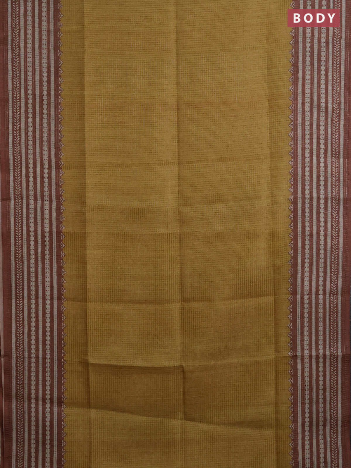 Chappa saree mustard shade and brown with allover small zari checked pattern and printed border