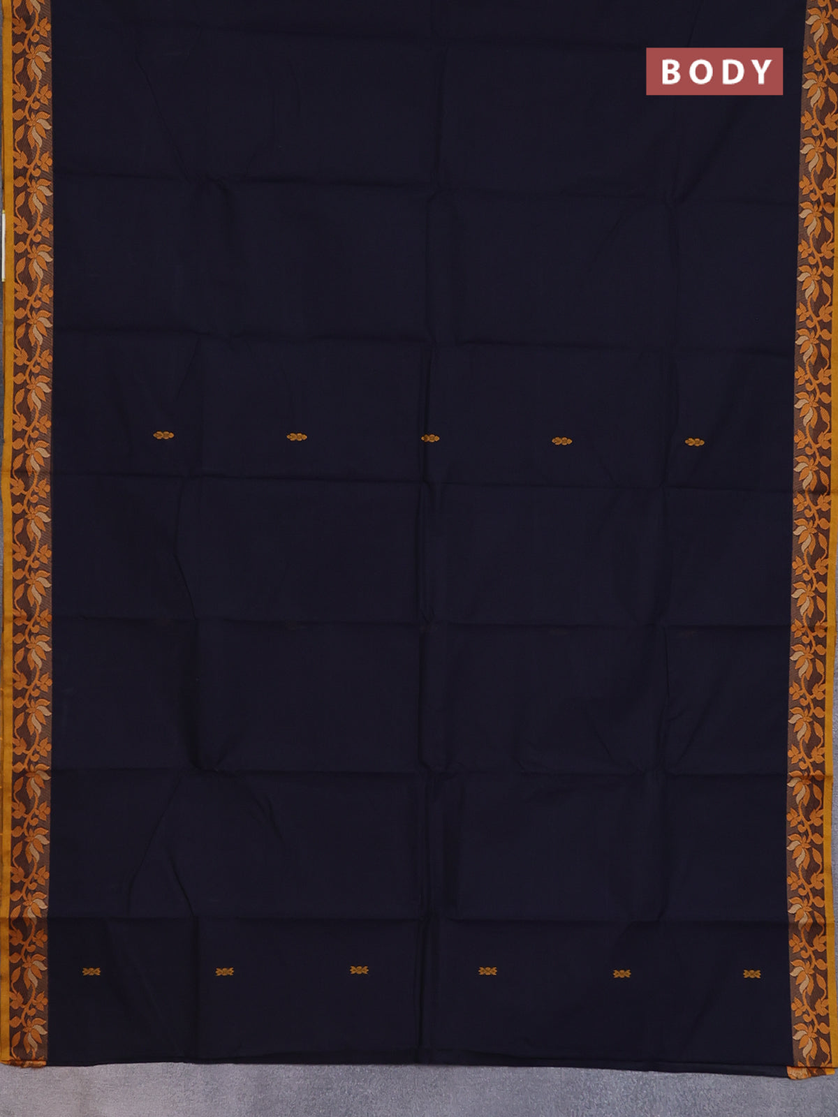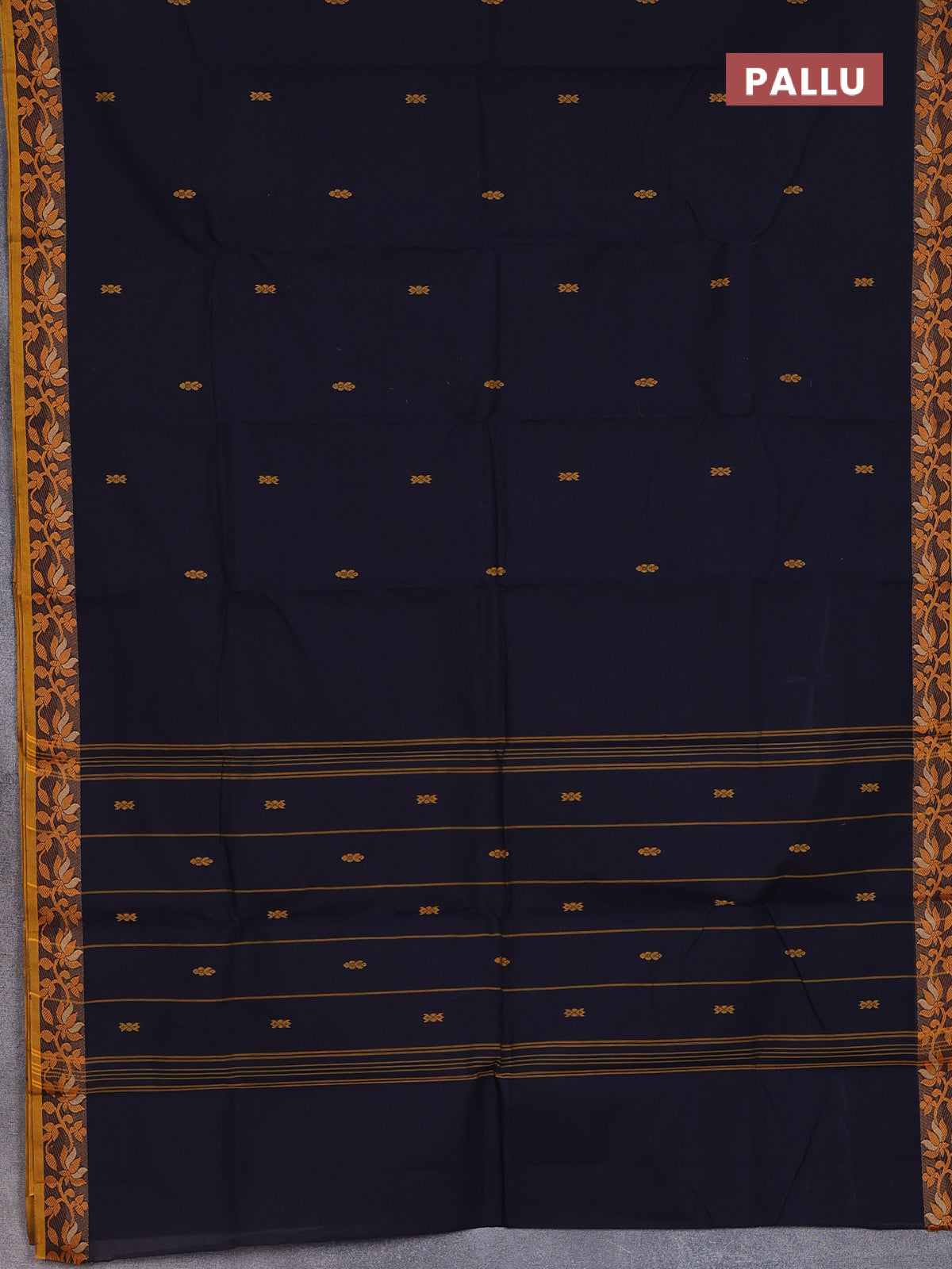 Chettinad cotton saree dark navy blue and mustard yellow with thread woven buttas and floral design border