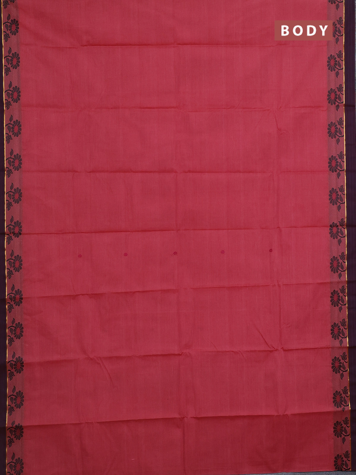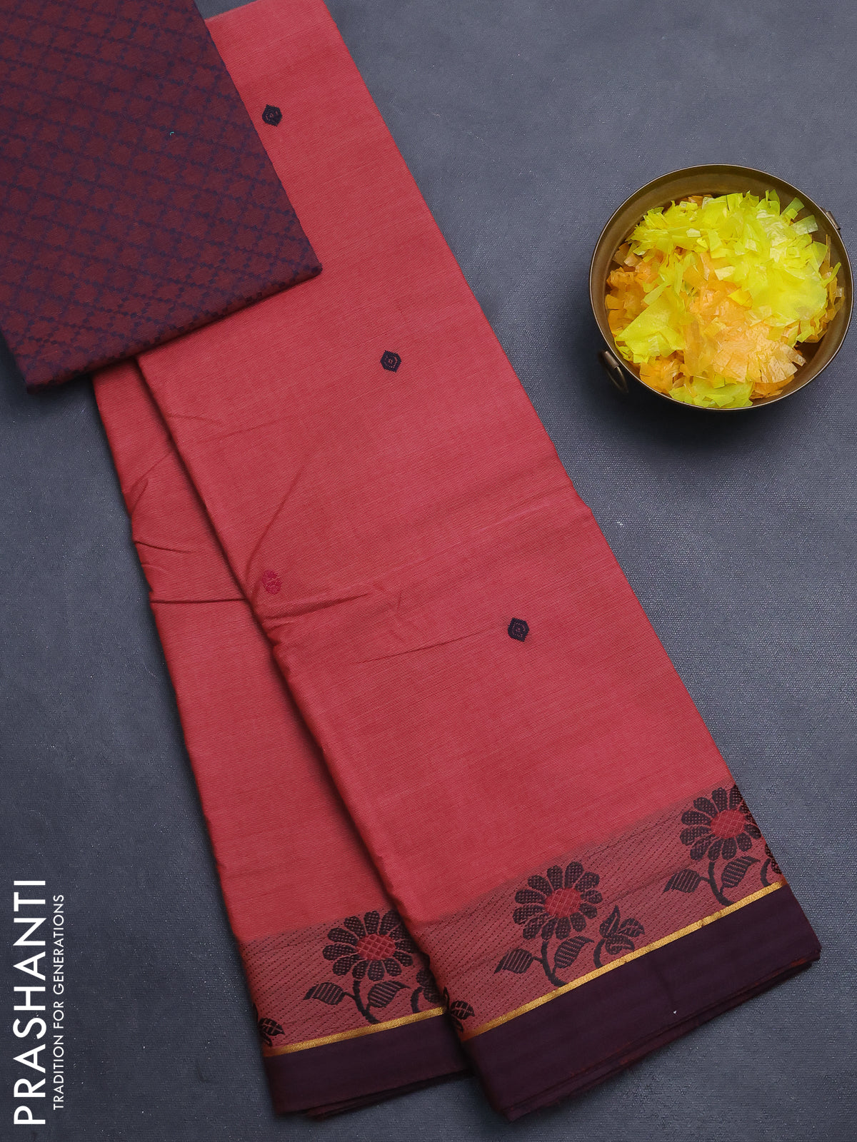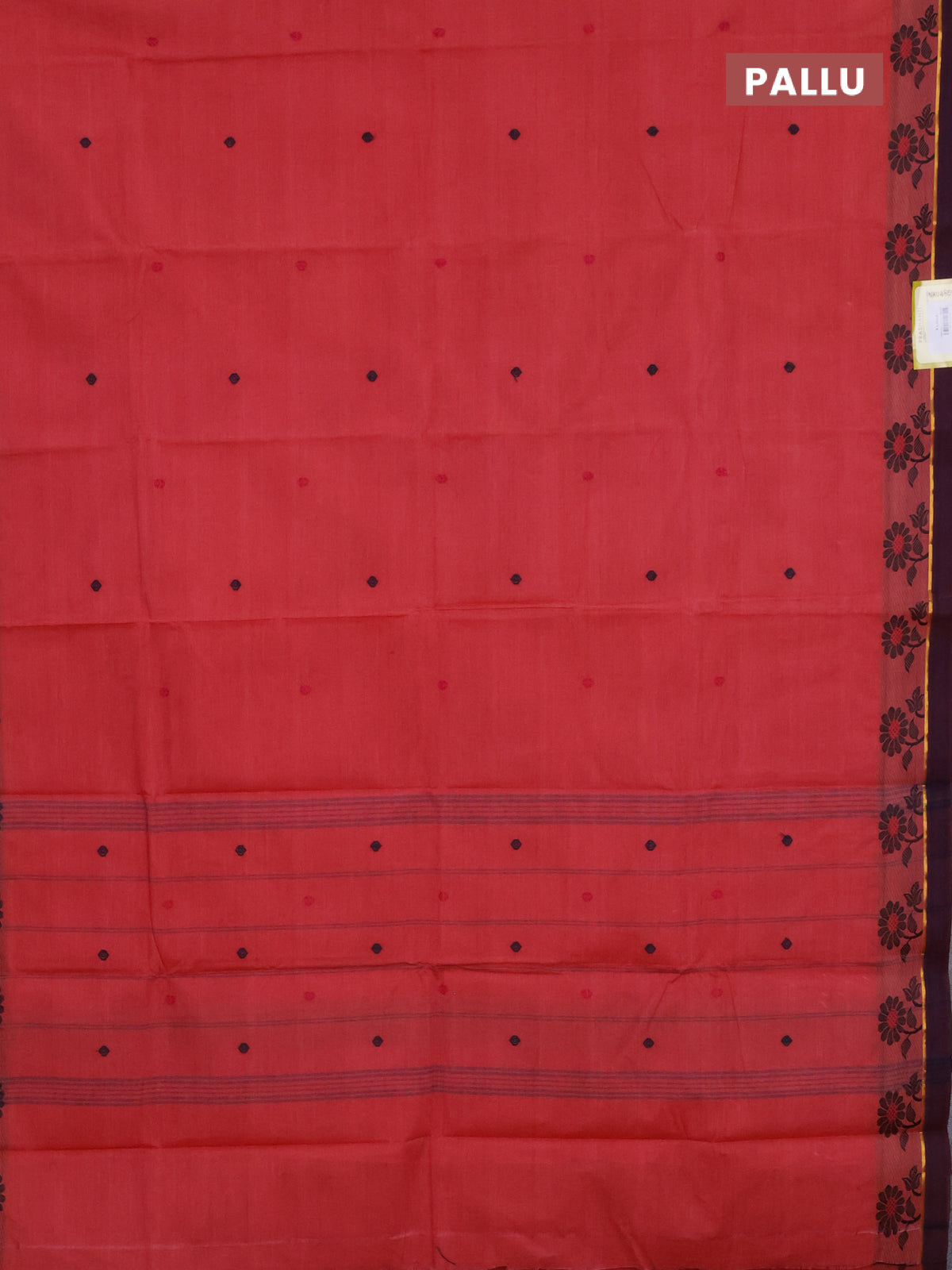 Chettinad cotton saree dark peach and deep maroon with thread woven buttas and thread woven border